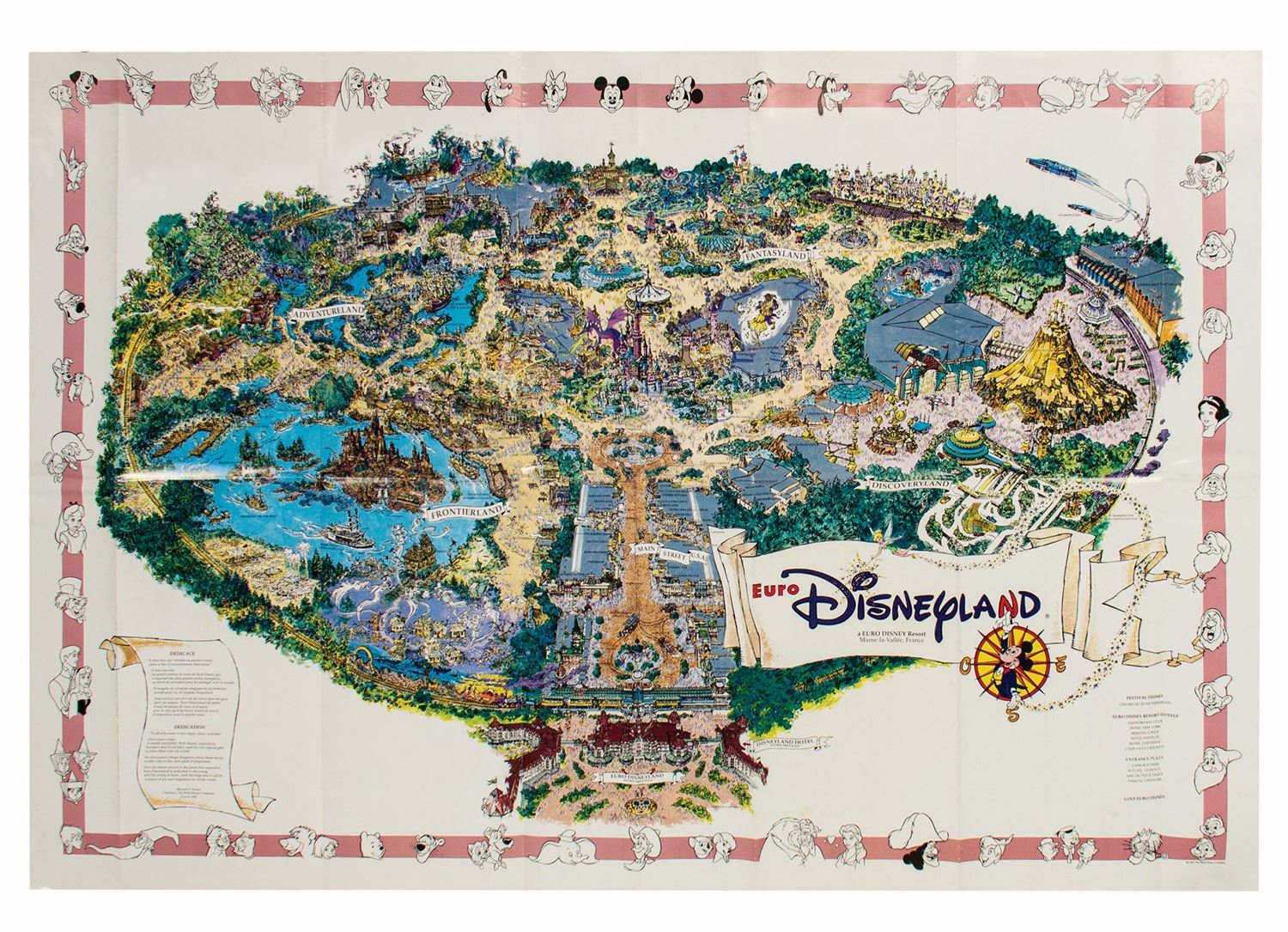 (Euro Disneyland, 1992) A large souvenir map from the opening year of Euro Disneyland. This beautifully illustrated map by legendary Imagineer and Disneyland cartographer Sam McKim is replete with elements marked “Attraction Future” where McKim has inserted proposed amusements still in the construction or planning stages alongside features that were completed in Euro Disneyland’s inaugural year. Folded as issued, the map measures a full 29.5”x44” and is in very good condition. It exhibits faint spot soiling above the Beast’s head in the lower blank area and some wear and bunching to folds.