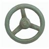 (Walt Disney World, 1970s) A prop hatch wheel from one of the Nautilus submarines used in the Magic Kingdom's 20,000 Leagues Under the Sea: Submarine Voyage attraction. Composed of a heavy resin, the wheel prop measures 10" in diameter and is in good used condition. There are scattered chips in the paint, and spots of weathering from its original outdoor use.