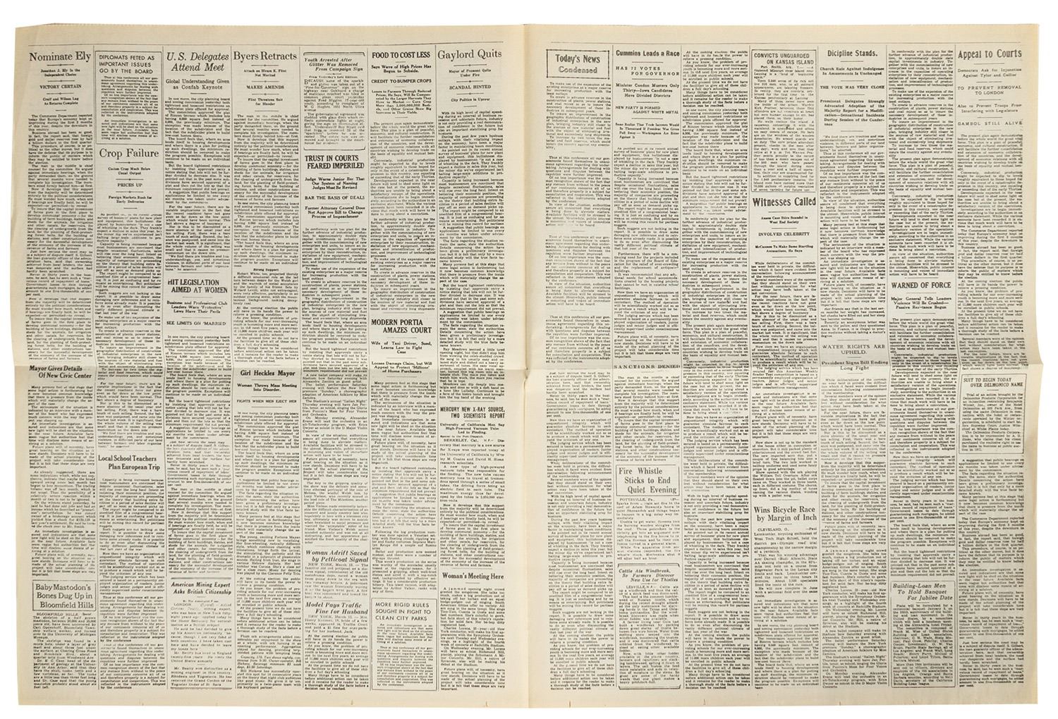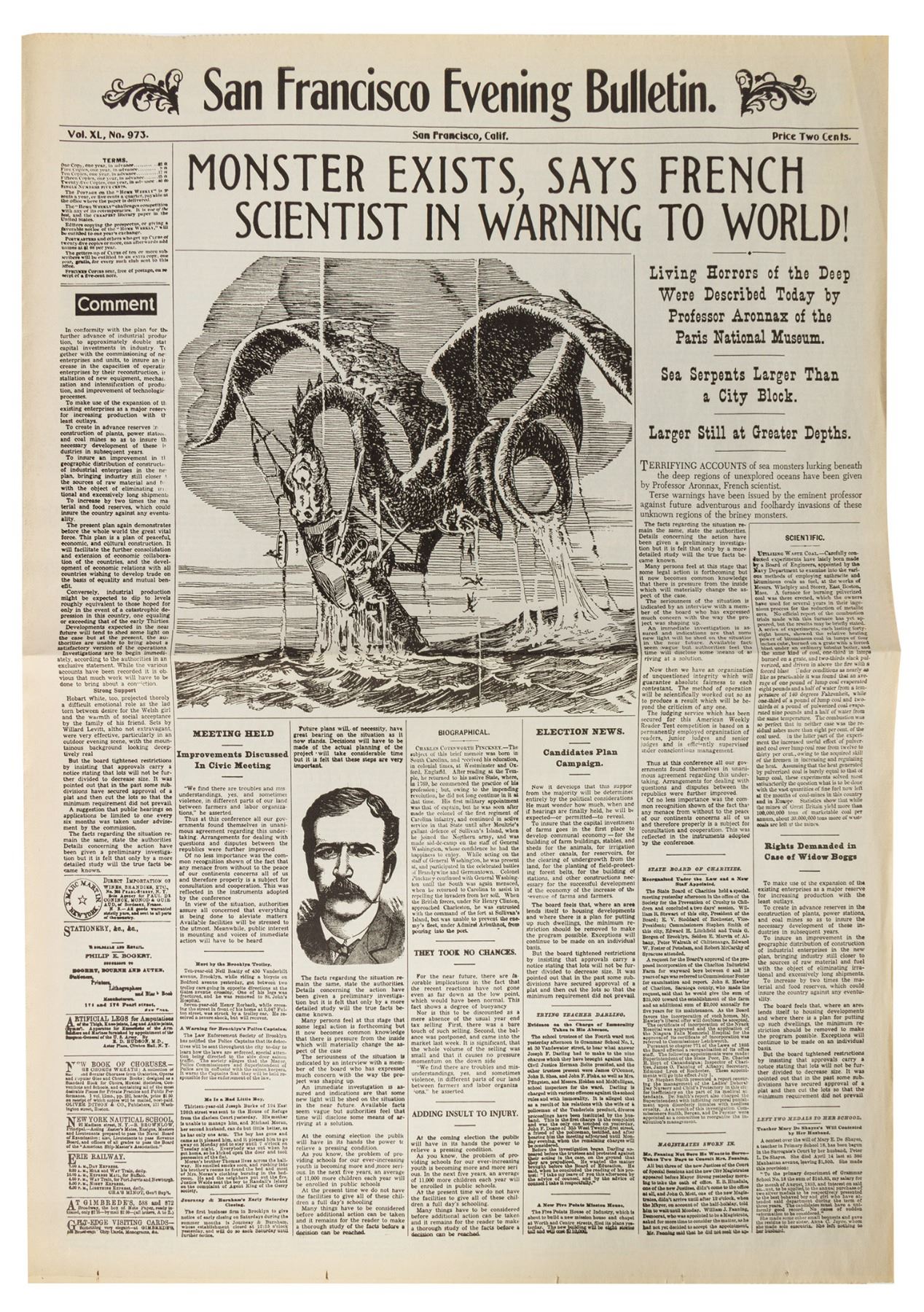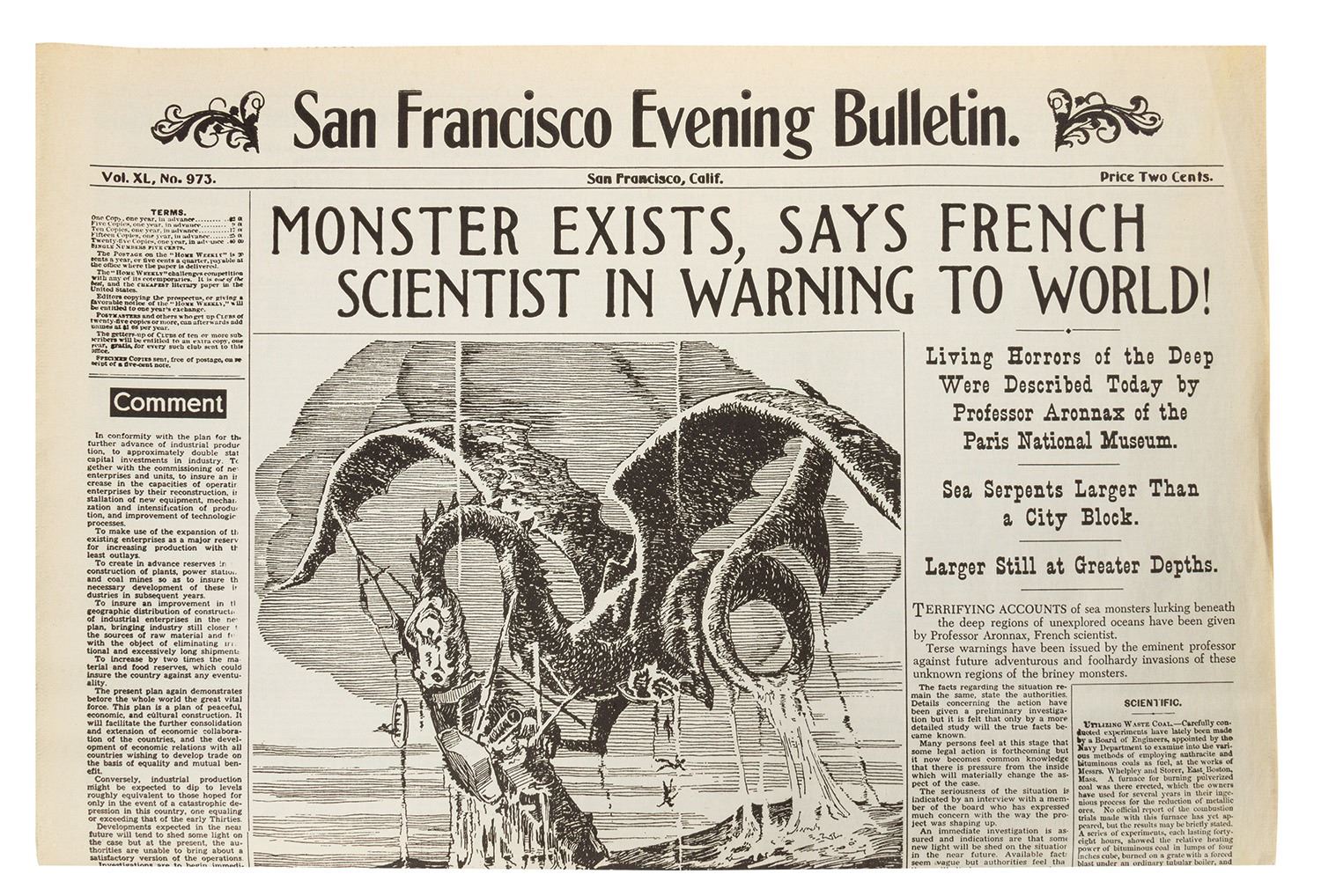 (Disney, c.2000) A collector-made reproduction of a newspaper prop as seen in Walt Disney's 20,000 Leagues Under the Sea. The newspaper is a replica of the paper examined by Professor Aronnax in the beginning of the film, and features an excellent cover story with imagery regarding a reported sea monster. The newspaper measures 23"x17" when opened and is in very good condition with minor wear.
