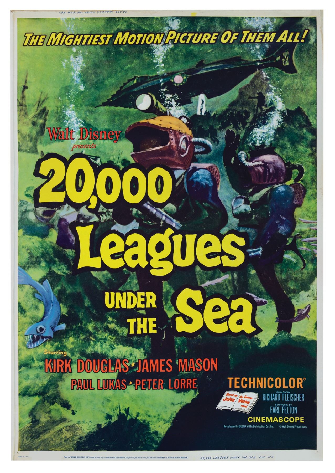 (Disney, 1963) A very rare 40x60 poster from the re-release of 20,000 Leagues Under the Sea. This poster was printed on cardstock in this larger size for theaters to use both inside and outside in promotional displays. As such, posters of this size are far rarer than the standard one sheets. The poster is in good condition with some edge-wear and spots of creasing down the center. There is discoloration around the edges, particularly at the top and upper right. The poster has been stored rolled.