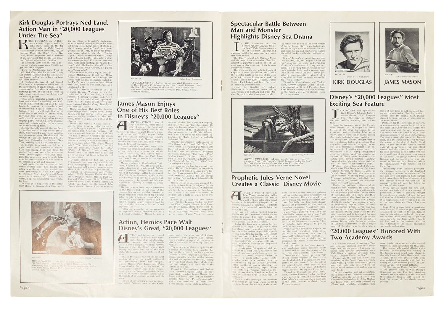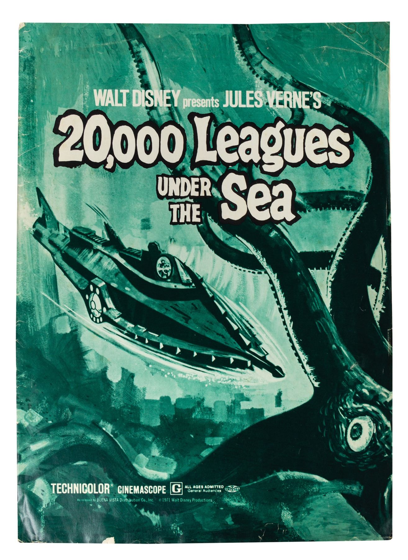 (Disney, 1971) A promotional campaign booklet for the theatrical re-release of 20,000 Leagues Under the Sea. The cover features wonderful imagery of the Nautilus and giant squid, and contains information on television and radio spots as well as sample news articles to help promote the film. The 6-page booklet measures 14.75"x11" and is in good condition with a few creases and edge-wear from use.