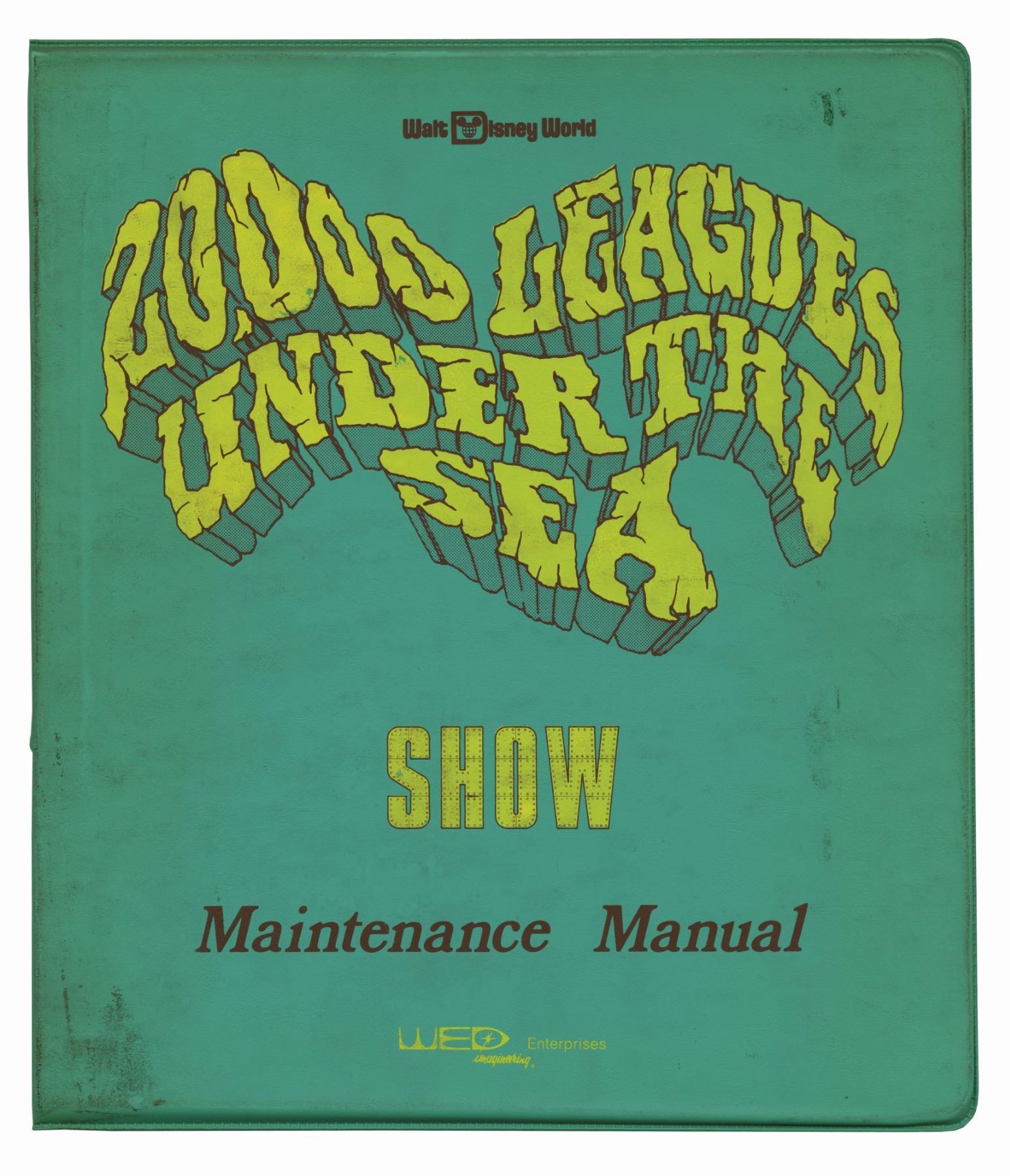 (Walt Disney World, c.1970s) A stylish cover for the WED Imagineering maintenance manual for 20,000 Leagues Under the Sea: Submarine Voyage. The manual has fantastic cover imagery, and although the inner components are missing, the cover itself is a great artifact in the attraction's history. Measuring 11.75"x10.25", the cover is in fair condition with surface wear throughout from use.