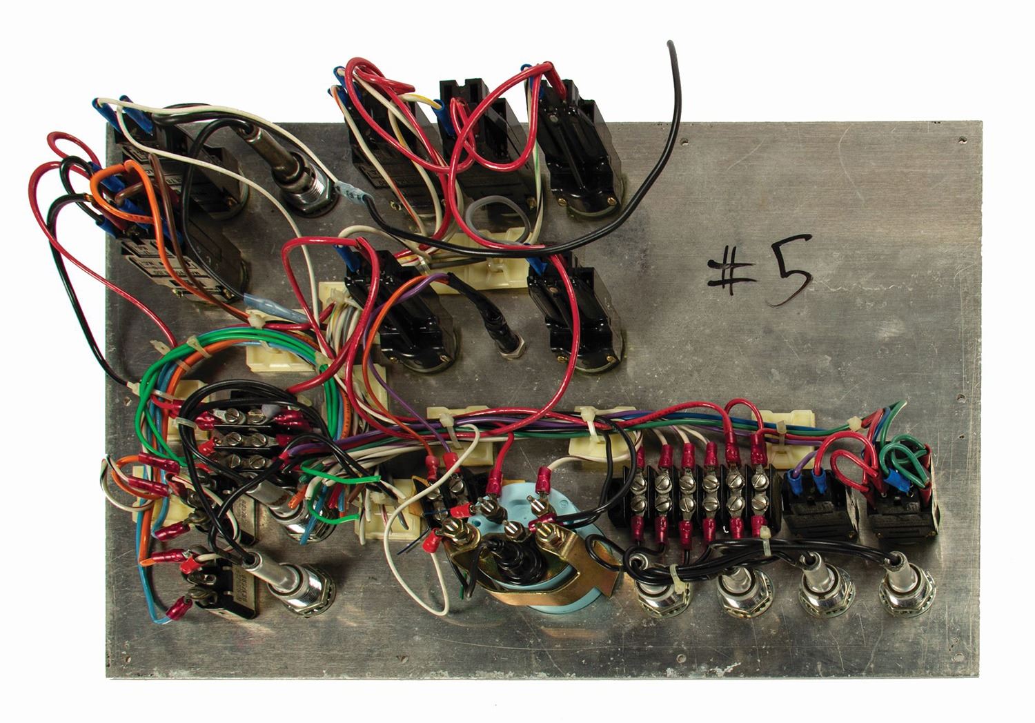 (Walt Disney World, c.1971-94) An original park-used control panel from the Nautilus #5 ride vehicle of the 20,000 Leagues Under the Sea: Submarine Voyage attraction at Walt Disney World. The panel consists of a metal plate covered by a printed decal identifying the sub’s controls that is faced with a sheet of clear acrylic. Real control lights, a temperature gauge, toggle switches, and buttons are embedded in the panel, and the wiring and circuitry is present on the reverse, with loose wires where it was removed from the submarine ride vehicle. This board controlled the fore and aft hatches, the sound system, lighting, the “engine room,” and emergency functions. The decal features a silhouette of the Nautilus with number 5 on the tail fin. The reverse of the panel is marked in felt pen “#5”. Measuring 11.25”x16.25” and 2.75” deep, the panel is in very good park used condition. The acrylic is cracked with some loss at the bottom right corner, a piece of the decal has rubbed away at bottom center, and there are a few scattered scuffs and tiny cracks. This lot provides a rare opportunity to own a highly desirable piece of this popular attraction and is just about the closest you could get to commandeering Captain Nemo’s ship.