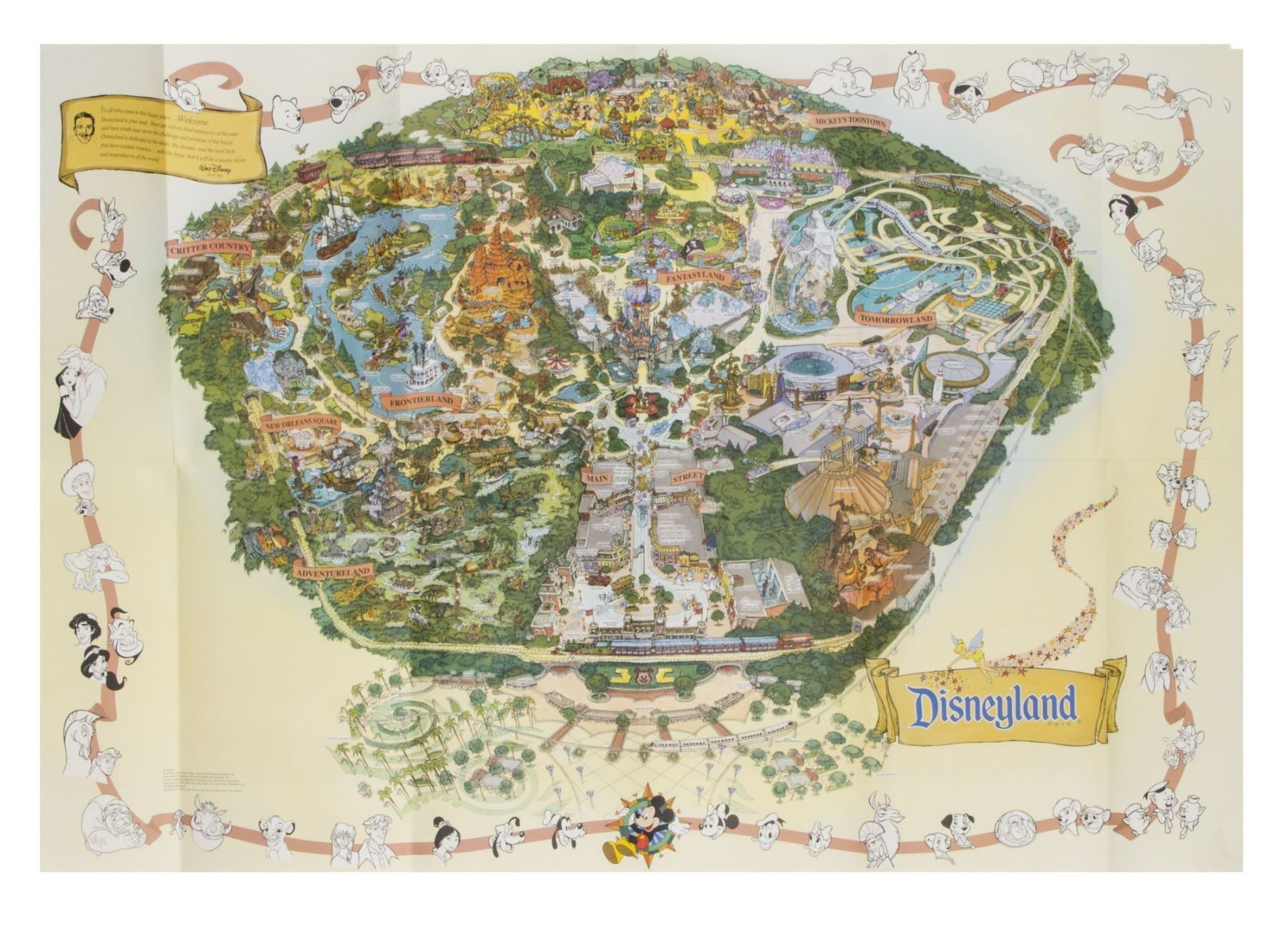 (Disneyland, 2001) A large souvenir map of Disneyland from 2001. This map features the change from "Mexican Cantina & Barbecue" to "Rancho Del Zocalo Restaurante" as well as the change to a swirling border. This item measures 27"x39" and is in very good condition with some wear along the fold-lines and minor edge-wear.