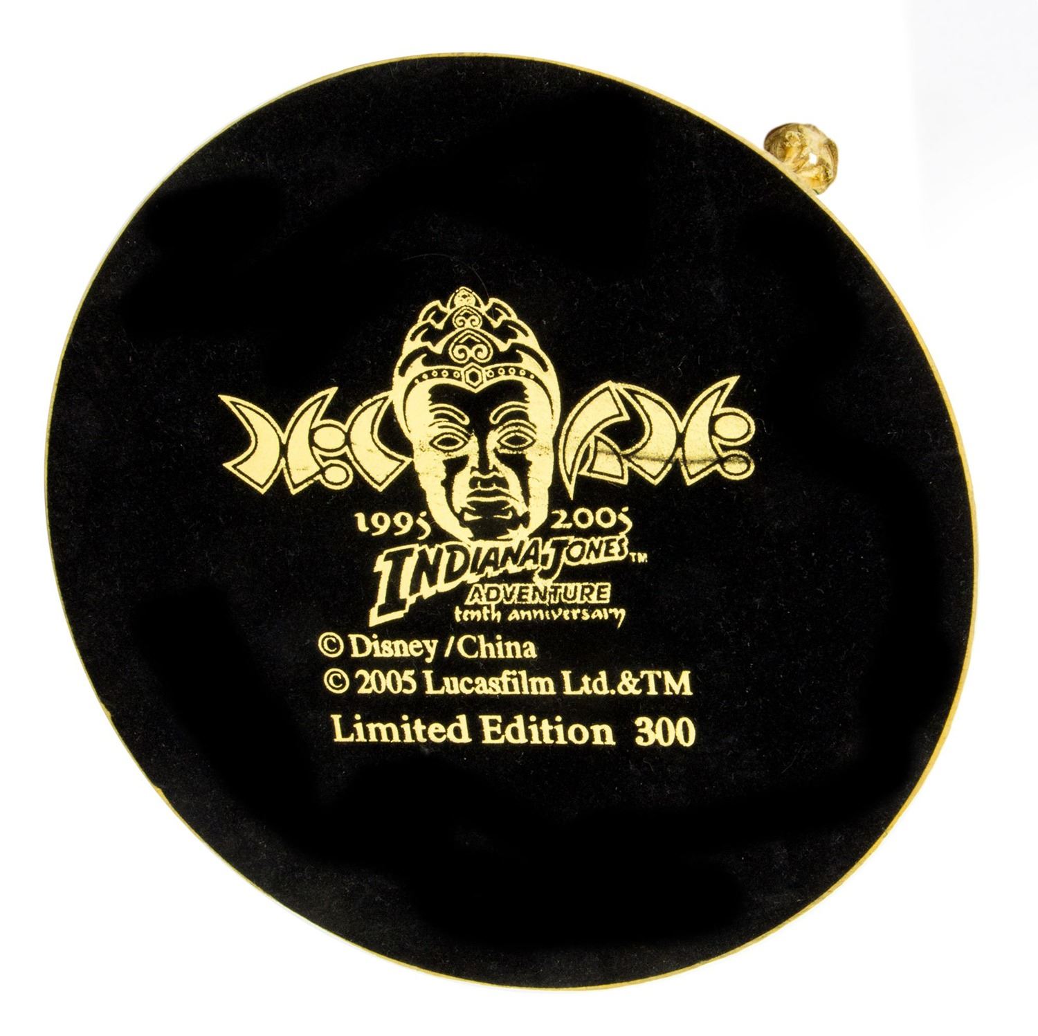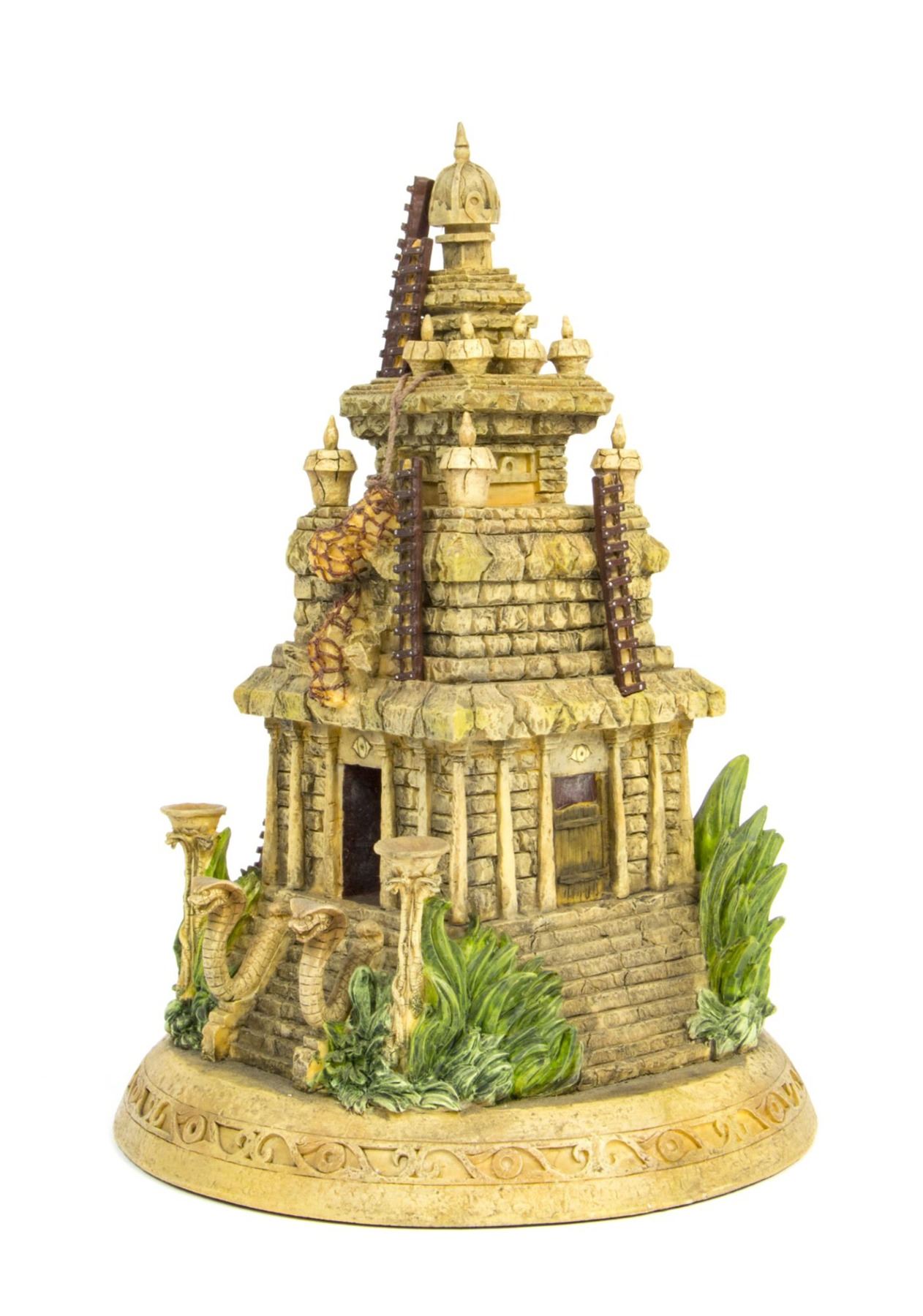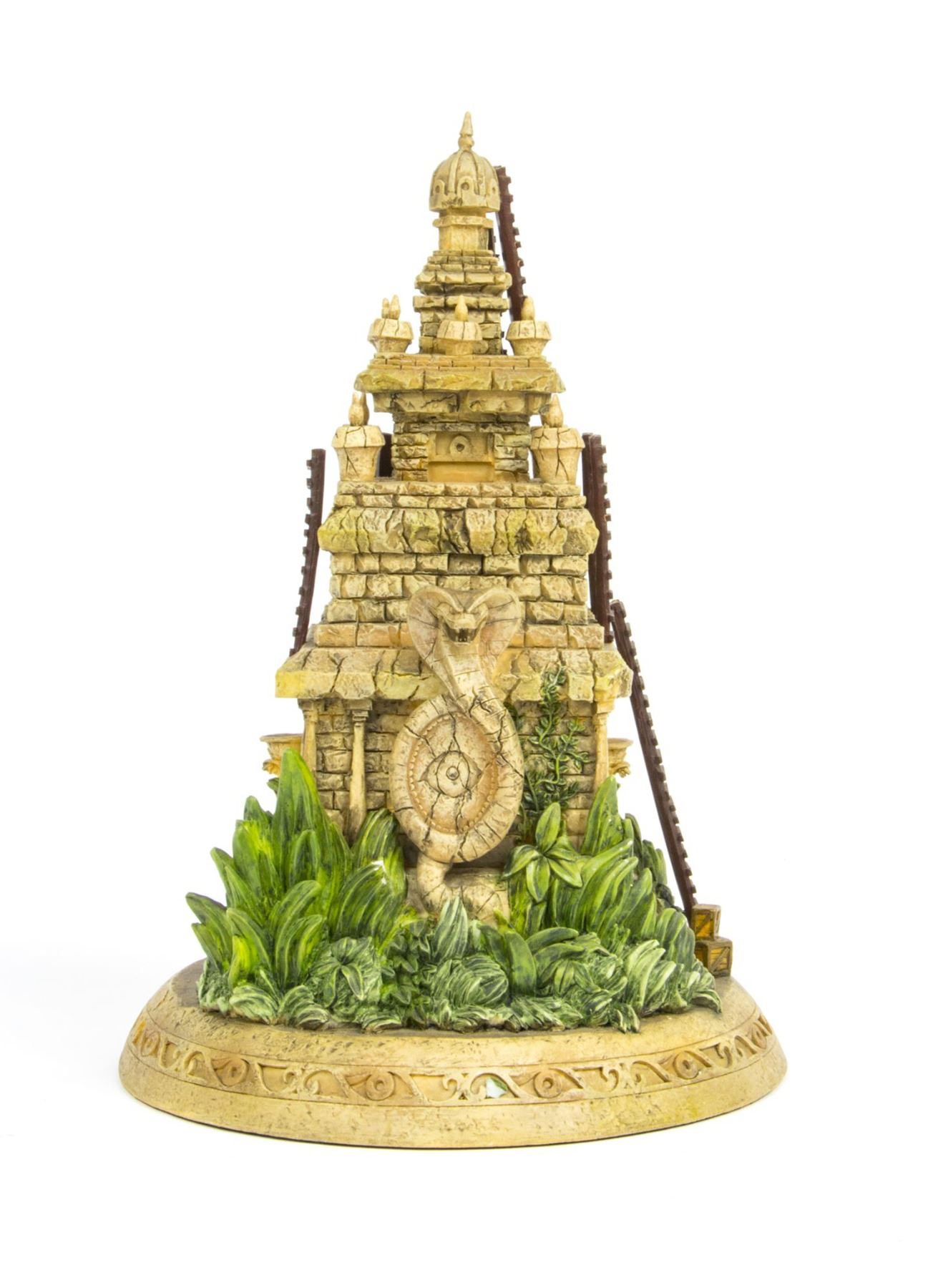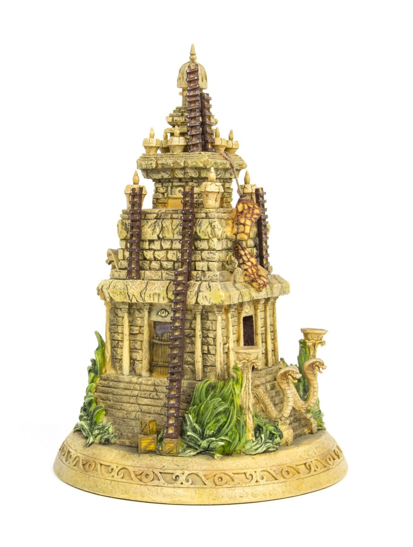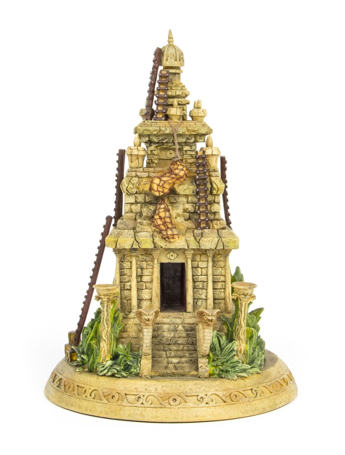 (Disneyland, 2005) A limited edition statue created to celebrate the 10th anniversary of Indiana Jones Adventure. Limited to only 300, this statue depicts the Mara Temple based on the attraction. Accomplished in painted resin, the statue measures 10" tall and is in good condition with a chip in one of the grass pieces on the reverse.