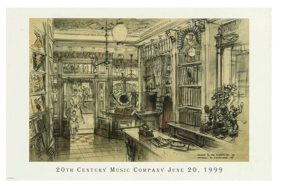 (Disneyland, 1999) A small poster created to mark the opening of the "20th Century Music Company" within Main Street on June 20, 1999. The shop has sold limited edition pins, Disney sheet music, cds, and other souvenirs over the years and this concept art provides a fantastic look at the inside of this unique location. This poster measures 11"x17" and is in good condition with a few minor surface scuffs.