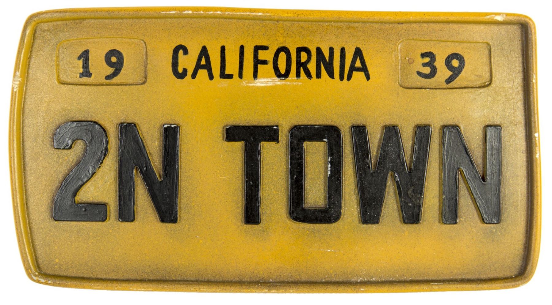 (Disneyland, 1990s) An original prop license plate created for Disneyland's "Roger Rabbit's Car Toon Spin" attraction. These thick resin license plates can be seen in the loading area for the attraction and feature humorous words and phrases spelt with the letters and numbers. This plate reads "2N TOWN" and measures 8.25"x15.5" and 0.75" thick. The condition is very good with some expected wear from use, including some paint wear on the front.