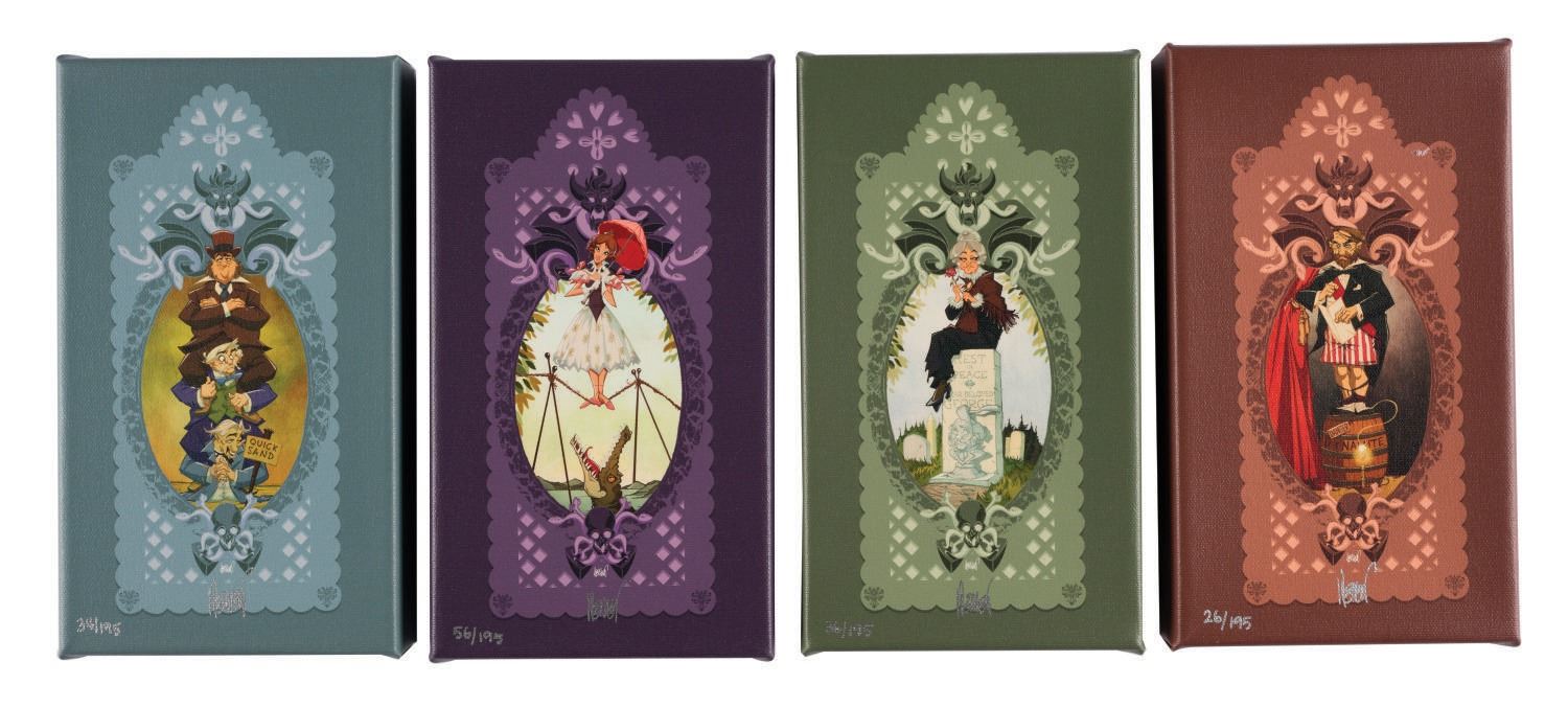 (Disneyland, 2018) A collection of (4) canvas prints inspired by the Stretching Portraits of The Haunted Mansion at Disneyland. The lot includes "Papel Picado Totem," "Papel Picado Dynamite," "Papel Picado Umbrella," and "Papel Picado Rest in Peace." Each print features an image created by artist Francisco Herrera and was once offered as a limited edition through Wonderground Gallery at Downtown Disney at Disneyland Resort. The prints are numbered and signed by the artist. Measuring 9"x5" and 1.5" wide, each print is in fine condition.
