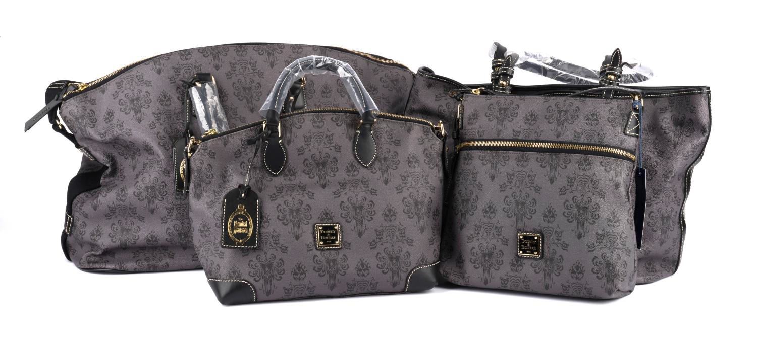 (Disney Parks) A collection of (4) Haunted Mansion wallpaper bags by Dooney & Bourke. The lot includes the satchel, weekender, crossbody, shopper with wallpaper pattern in screen-printed art on coated cotton with leather straps, each in fine unused condition.
