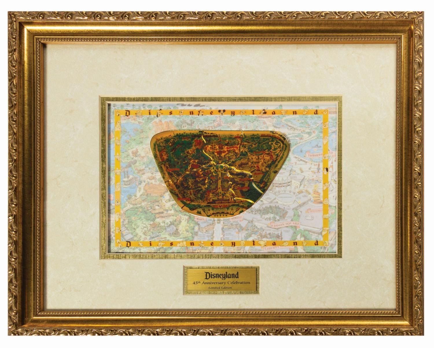 (Disneyland, 2000) A limited edition framed set of (6) pins created for Disneyland's 45th anniversary. This framed version was sold through the Disneyana store in an edition of only 100. The (6) pins depicting Sam McKim's iconic Disneyland souvenir map are mounted on a backdrop of that same map, which is beautifully matted with a plaque celebrating the anniversary. Measuring approximately 6.5"x9.75" in its 14.25"x17.5" frame, the pin display is in very good condition with some spots of cracking and chipping to the frame paint along the bottom edge. The epoxy resin covering the pins has yellowed with age, making them appear darker.