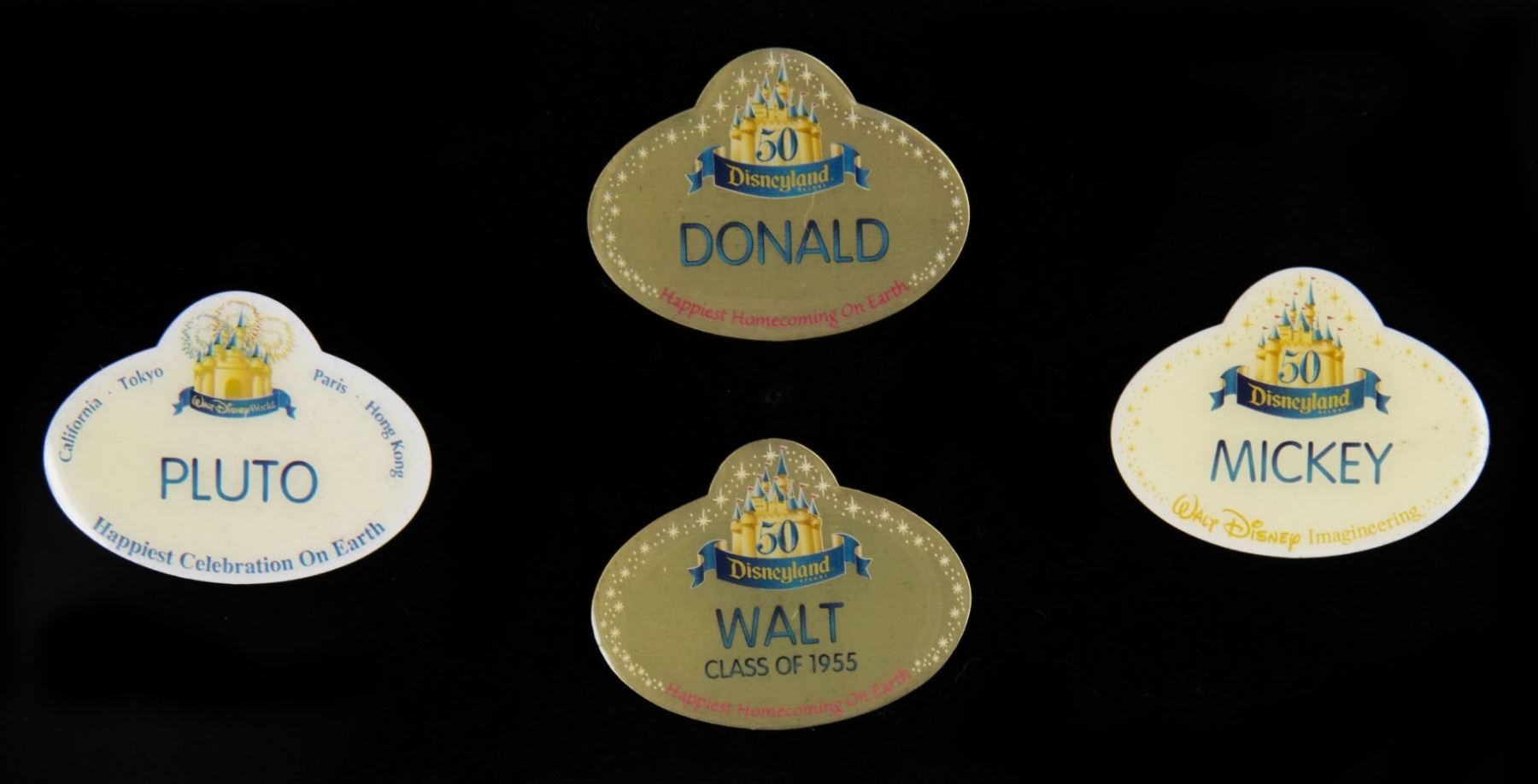 (Disneyland, 2005) A limited edition pin set modeled after cast member name tags for Disneyland's 50th Anniversary. The back of the pin case describes that the pins "are replicas of the new name tags that will be worn during the 18 month celebration, 2005-2006". Each of the (4) pins was limited to only 5000 pieces, and the names on the pins include Walt, Mickey, Donald, and Pluto. Each pin measures 1.25"x1.5" and the set is in very good condition.