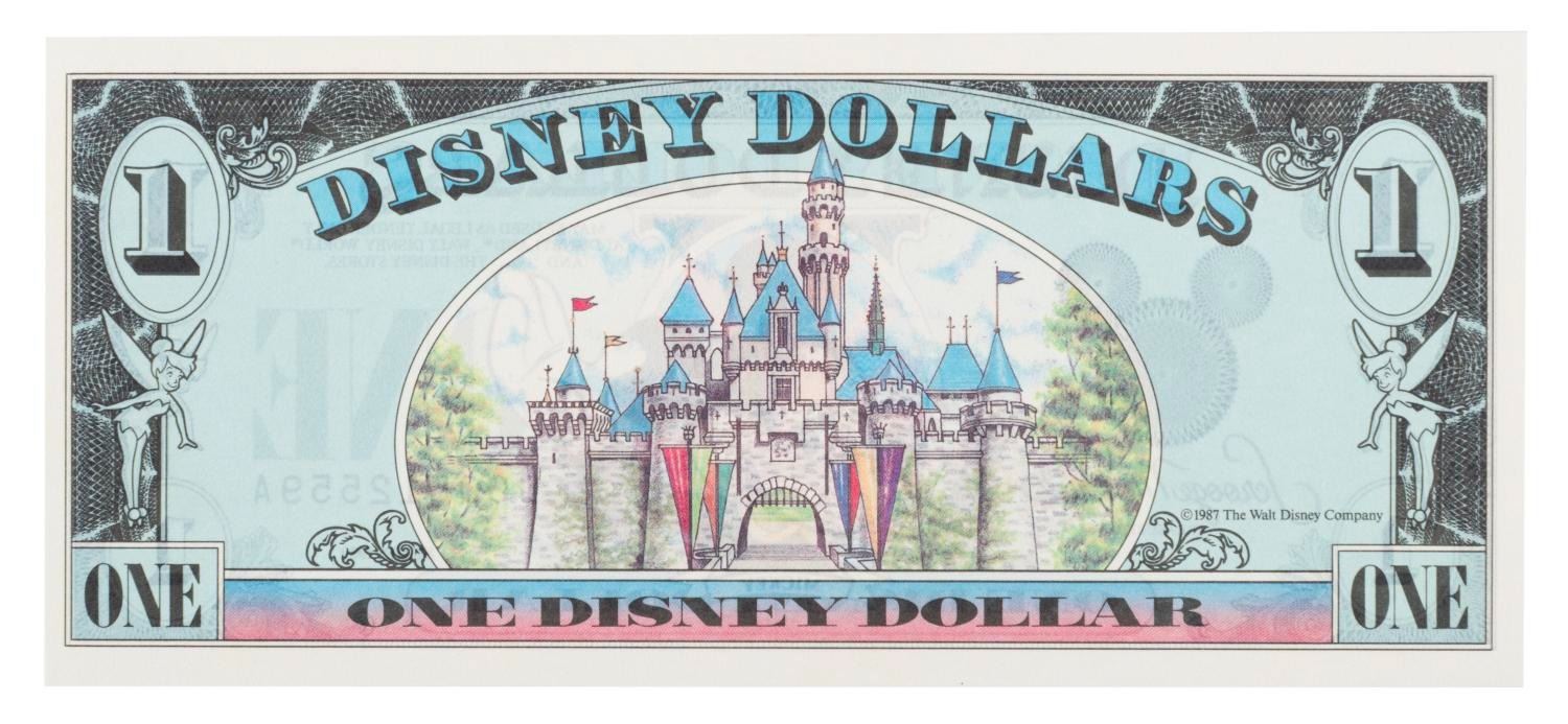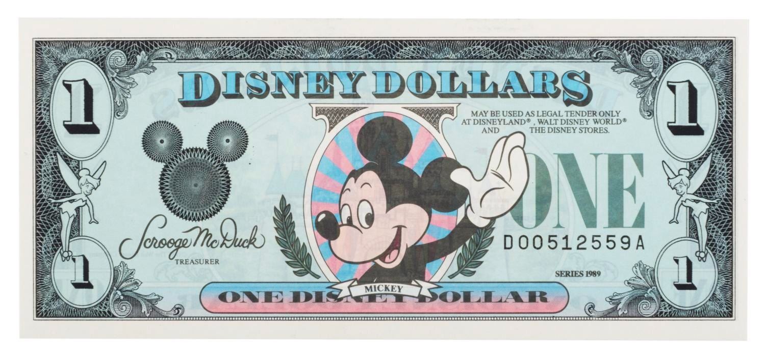 (Disney, 1989) A Mickey Mouse Disney Dollars $1 bill from Series 1989, numbered D00512559A. Measuring 2.75" x 6.25", the dollar is in fine condition.