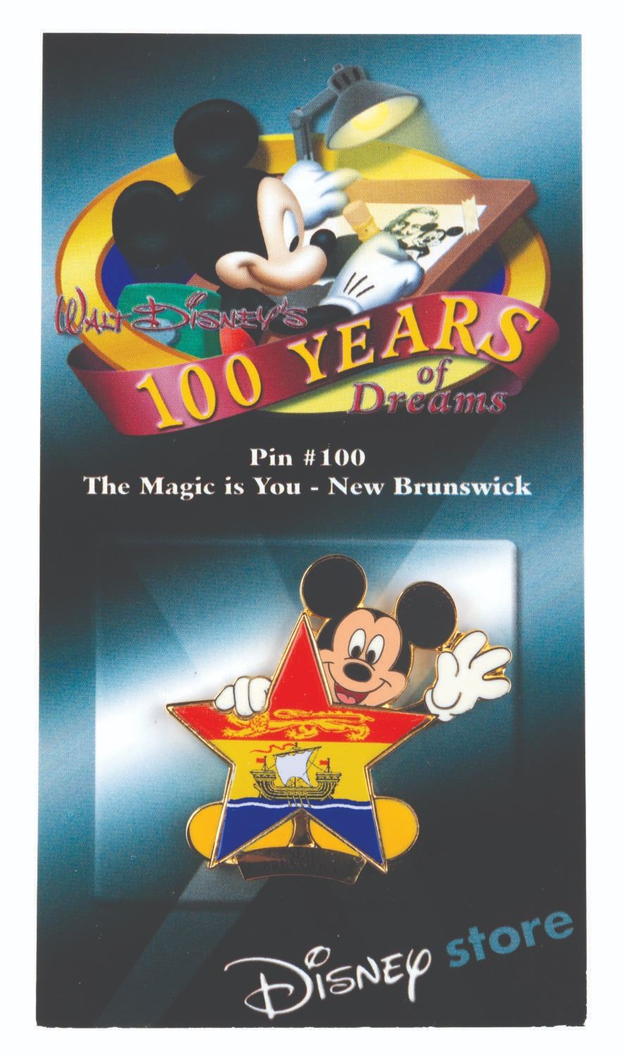 (Disney, 2001) A 100 Years of Dreams New Brunswick pin. Pin 100 of this series was produced with the flag of every state and province that had a Disney Store. For those with a single store like New Brunswick, no more than 75 pins were produced. The pin is in fine condition, on the original card.