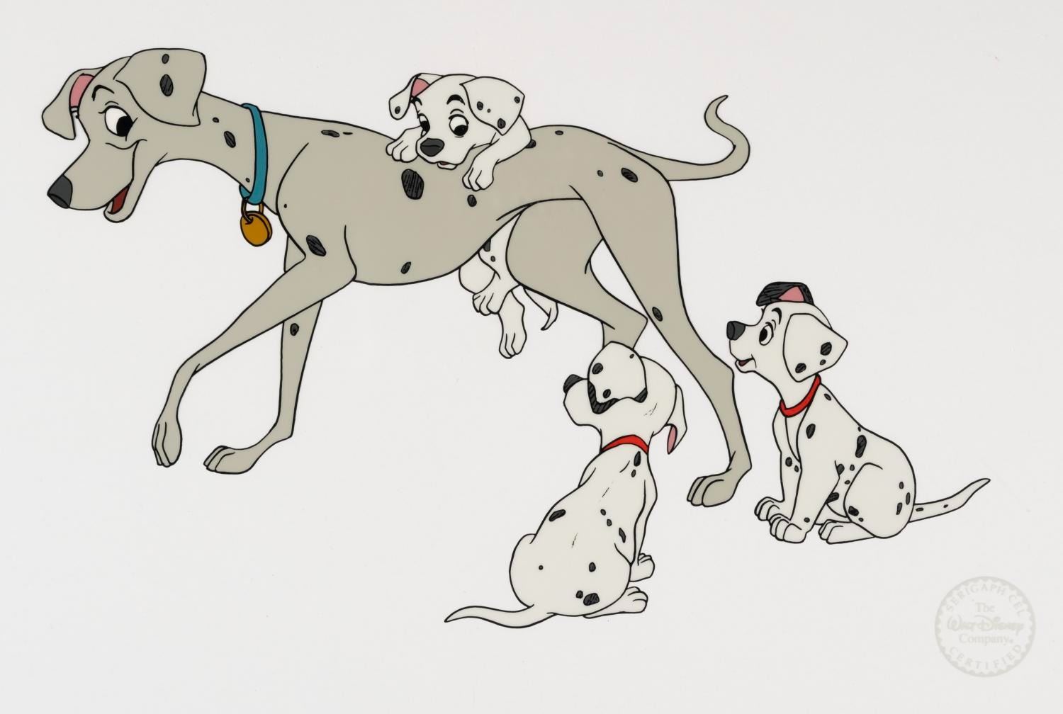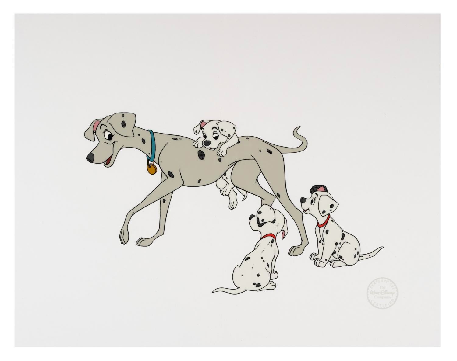 (Disney, 1990s) A limited edition sericel inspired by the Walt Disney Studios 1961 animated film “One Hundred and One Dalmatians.” Featuring Perdita with three of her puppies, the piece is a recreation of a frame from the original film, and was produced in an edition of only 1,000 pieces. Measuring 11" x 14" overall and with the character image measuring 6.5" x 11", the sericel is in very good condition with very light handling and edge wear.