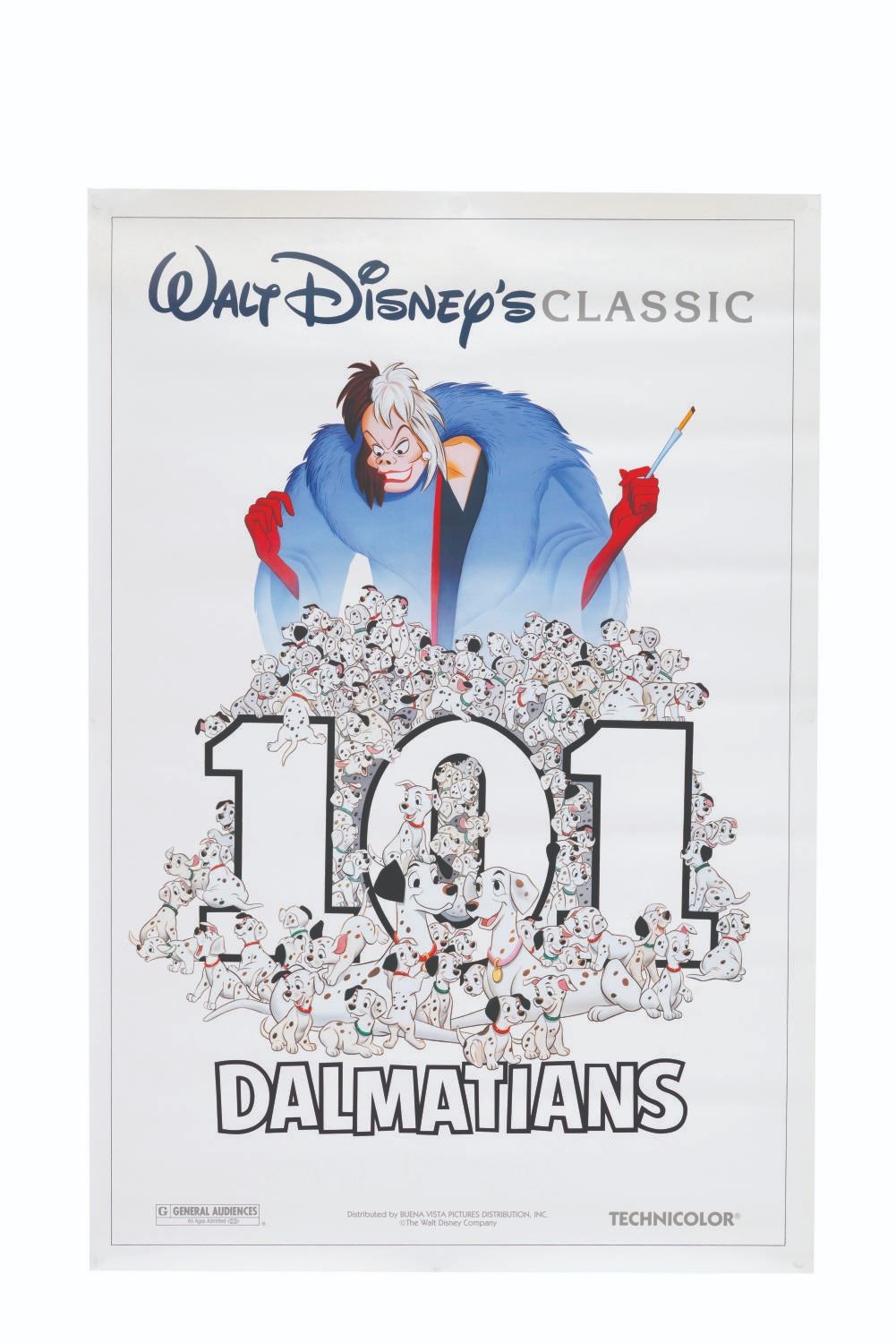 (Disney, 1985/91) A one-sheet for the 1985 or 1991 re-release of "One Hundred and One Dalmatians, " featuring Cruella De Vil. Measuring 27 " x 40 ", the poster is in good condition with light handling wear, a few small creases, and light spotting.