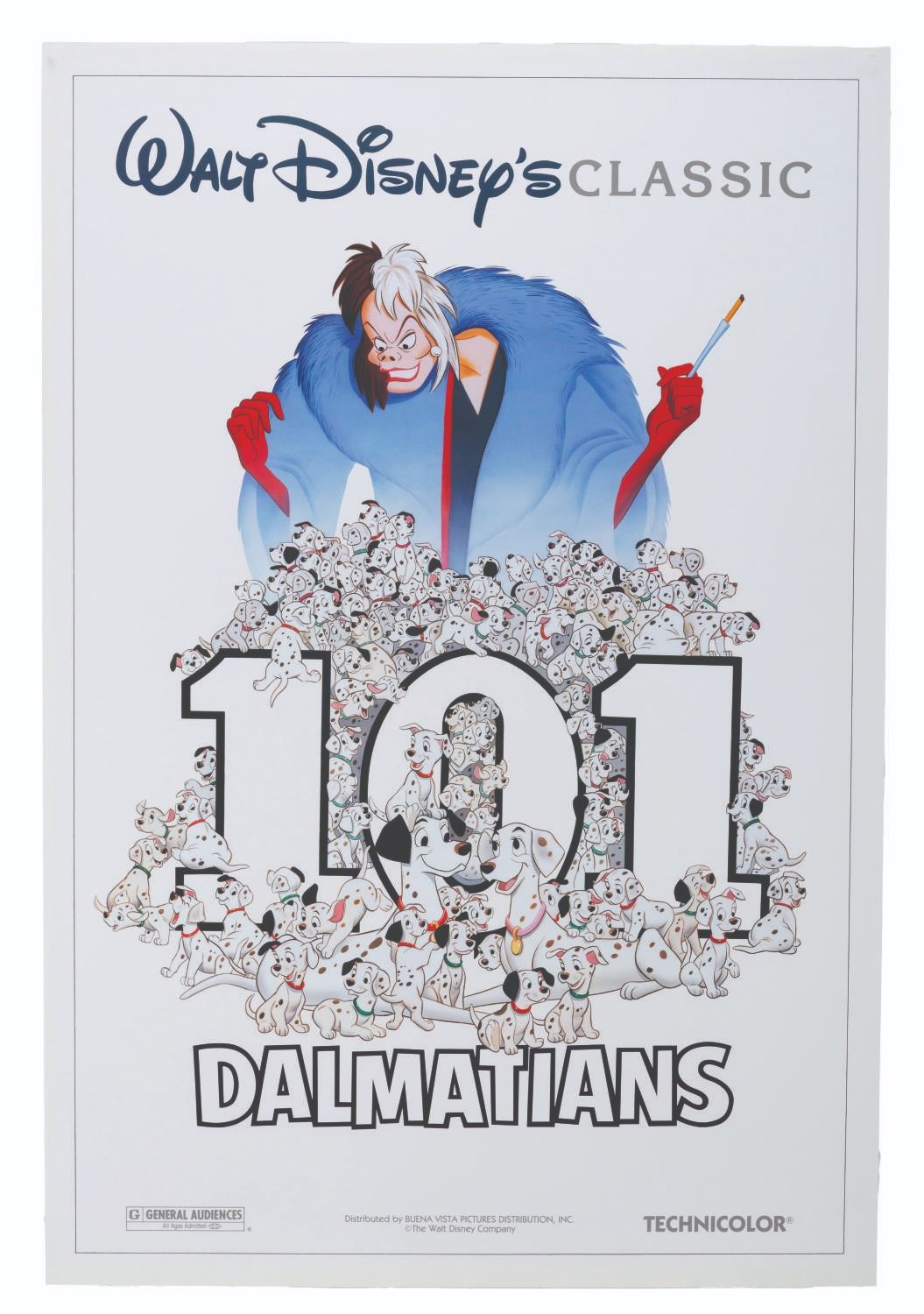 (Disney, 1991) An original one-sheet for the 1991 theatrical re-release of Walt Disney’s classic"101 Dalmatians." Measuring 27" x 40", the poster is in very good condition with light creases.
