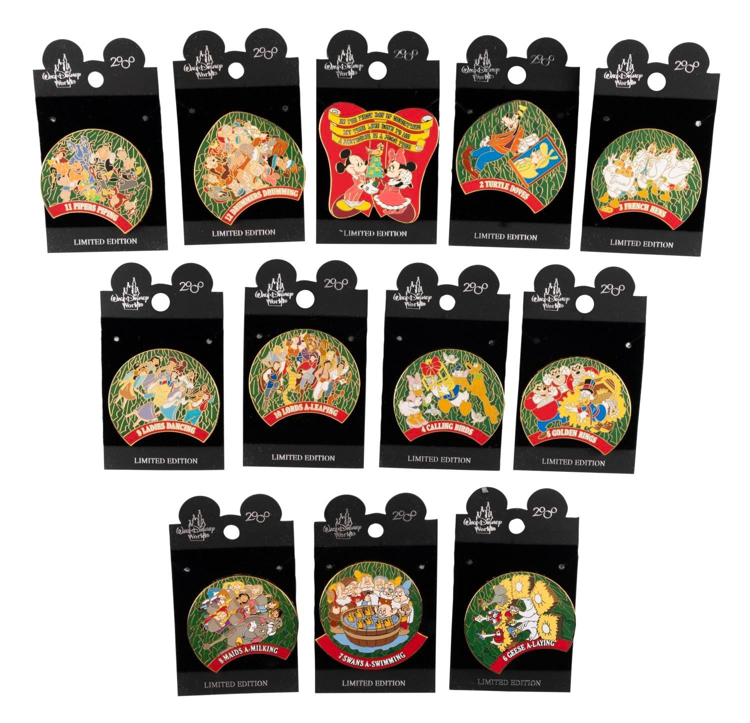 (Walt Disney World, 2002) A rare complete set of "12 Days of Christmas" pins, released in an edition of 2,000. When put together the pins form a "wreath" Measuring 2" in diameter, each pin is in fine condition on its original card.