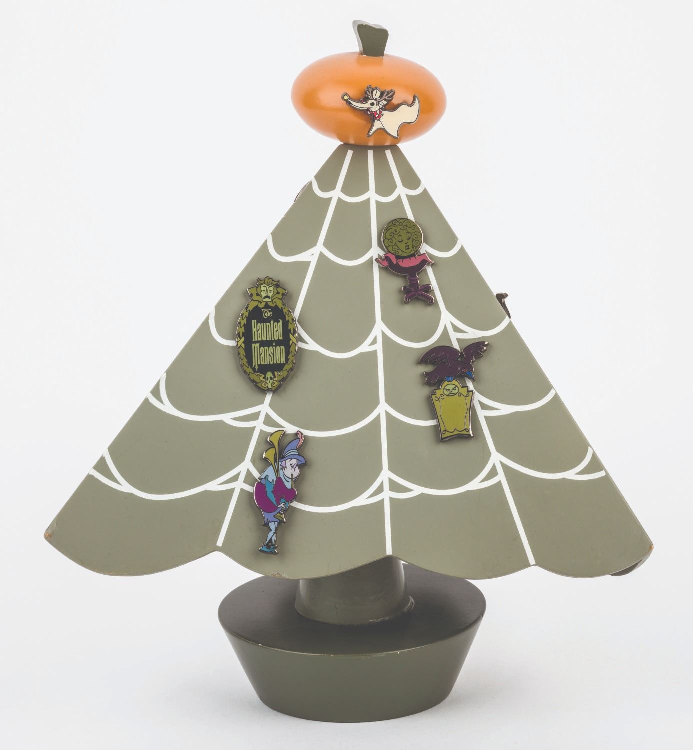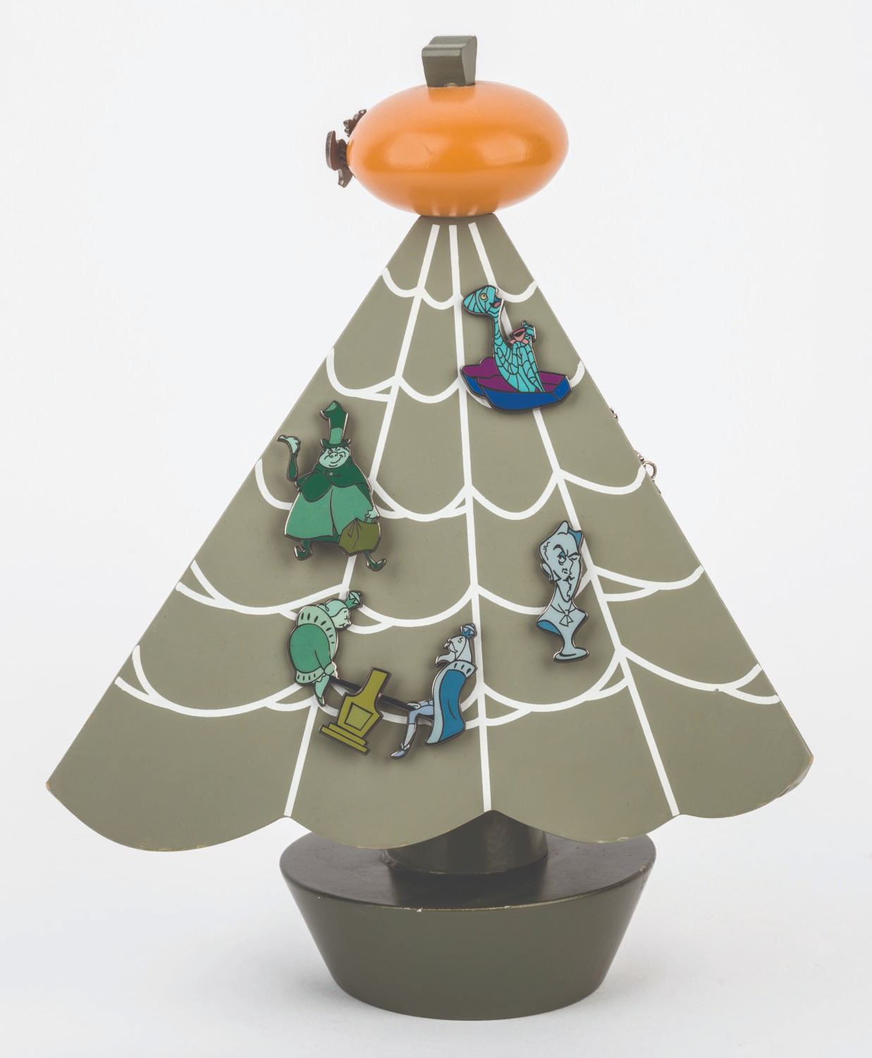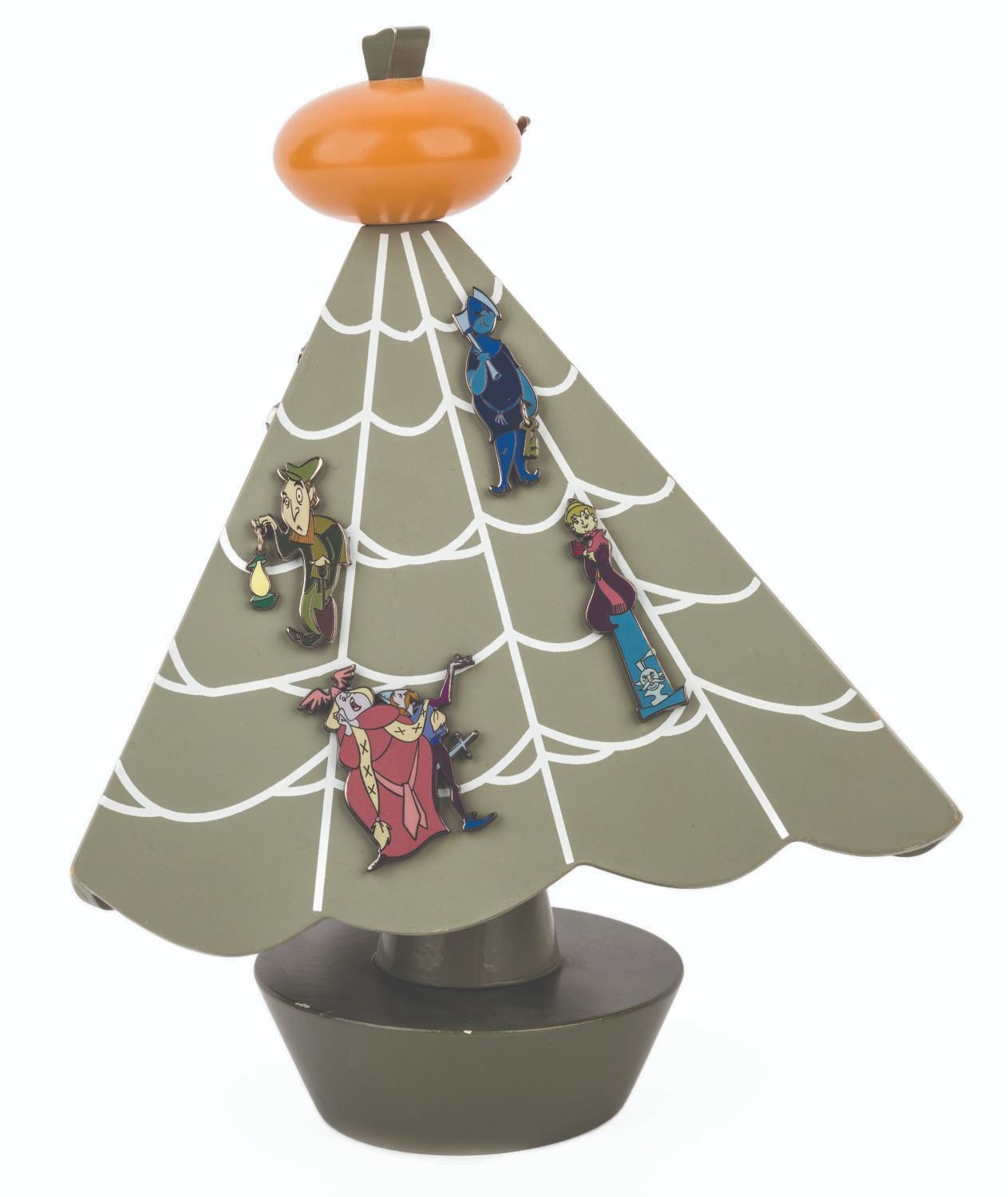 (Disney, 2004) A "13 Days of Christmas" series pin set with the original display, released through the Disney catalog and the Disney Store. Included are 13 pins of characters from the Haunted Mansion and Zero from "Tim Burton's The Nightmare Before Christmas." Each pin is mounted to a wooden Christmas tree inspired by the Haunted Mansion Holiday ride overlay. Measuring 11.5" tall and 9.75" at its widest, the display is in very good condition with minor wear to edges and corners from handling and age.