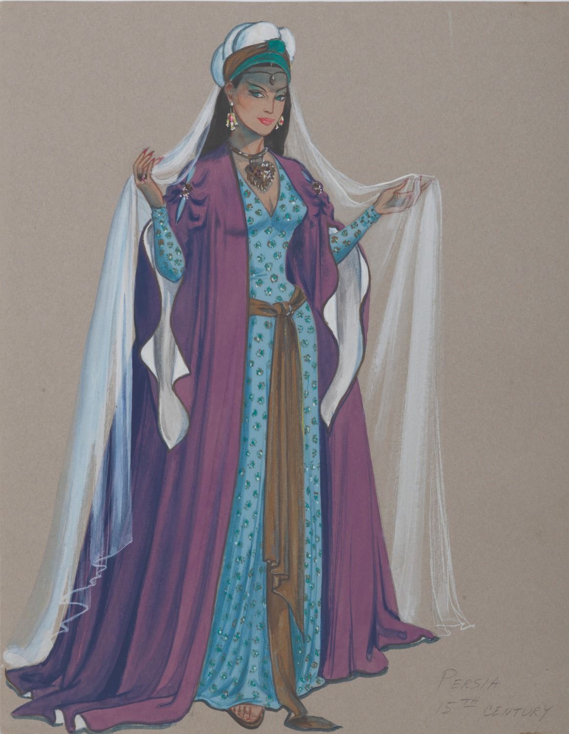 (Giokaris) A 15th Century Persia costume design by Paula Giokaris. Accomplished in gouache and pencil, the 10.25"x13" artwork is in fine condition.