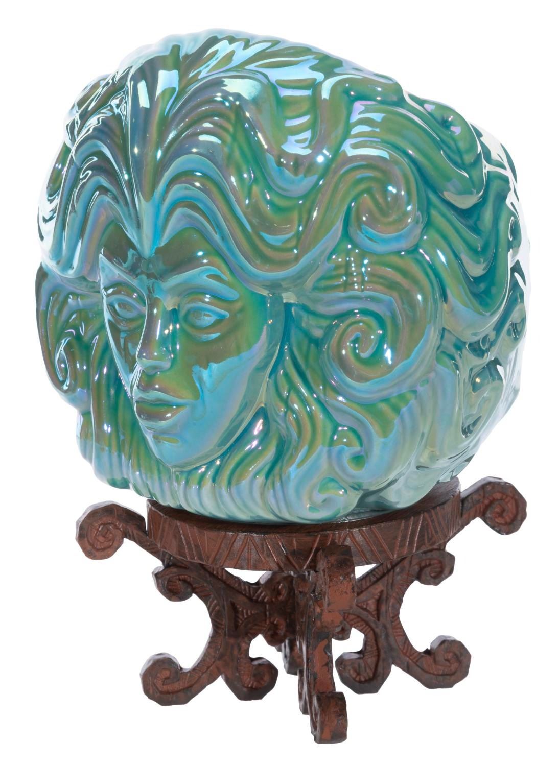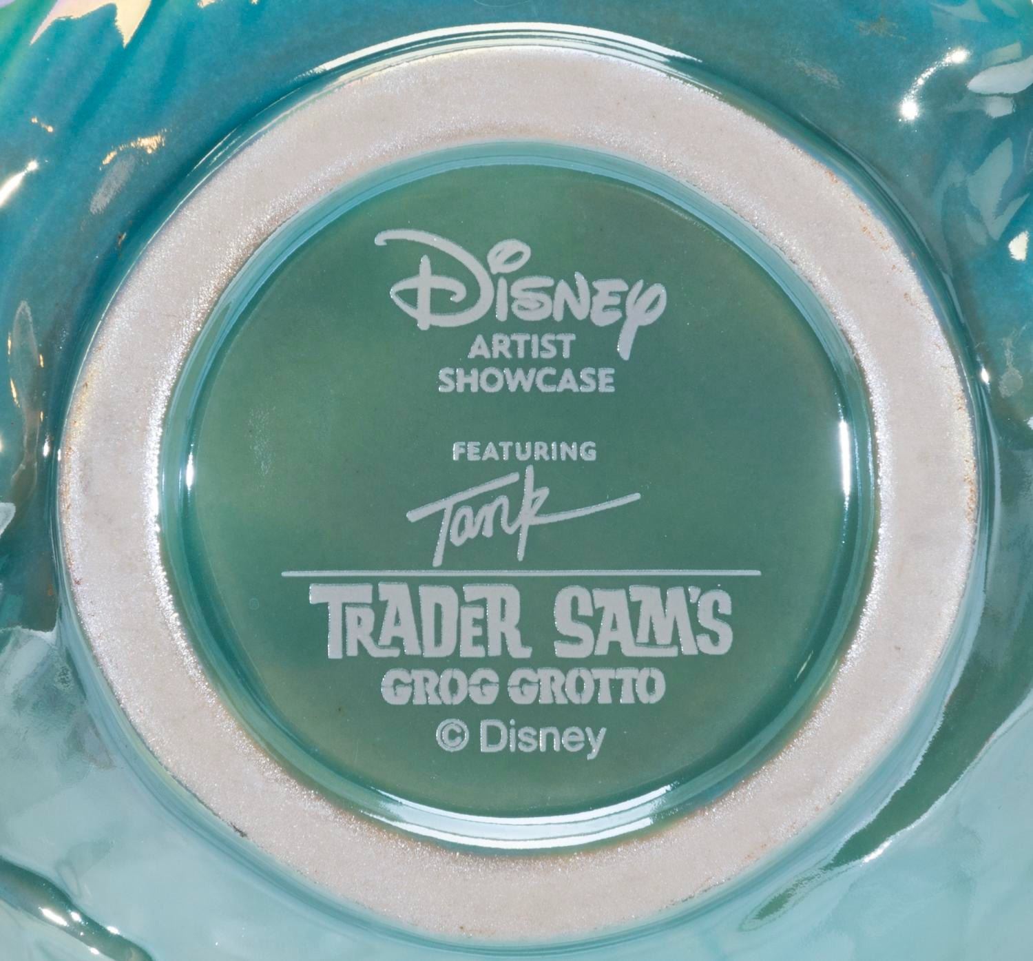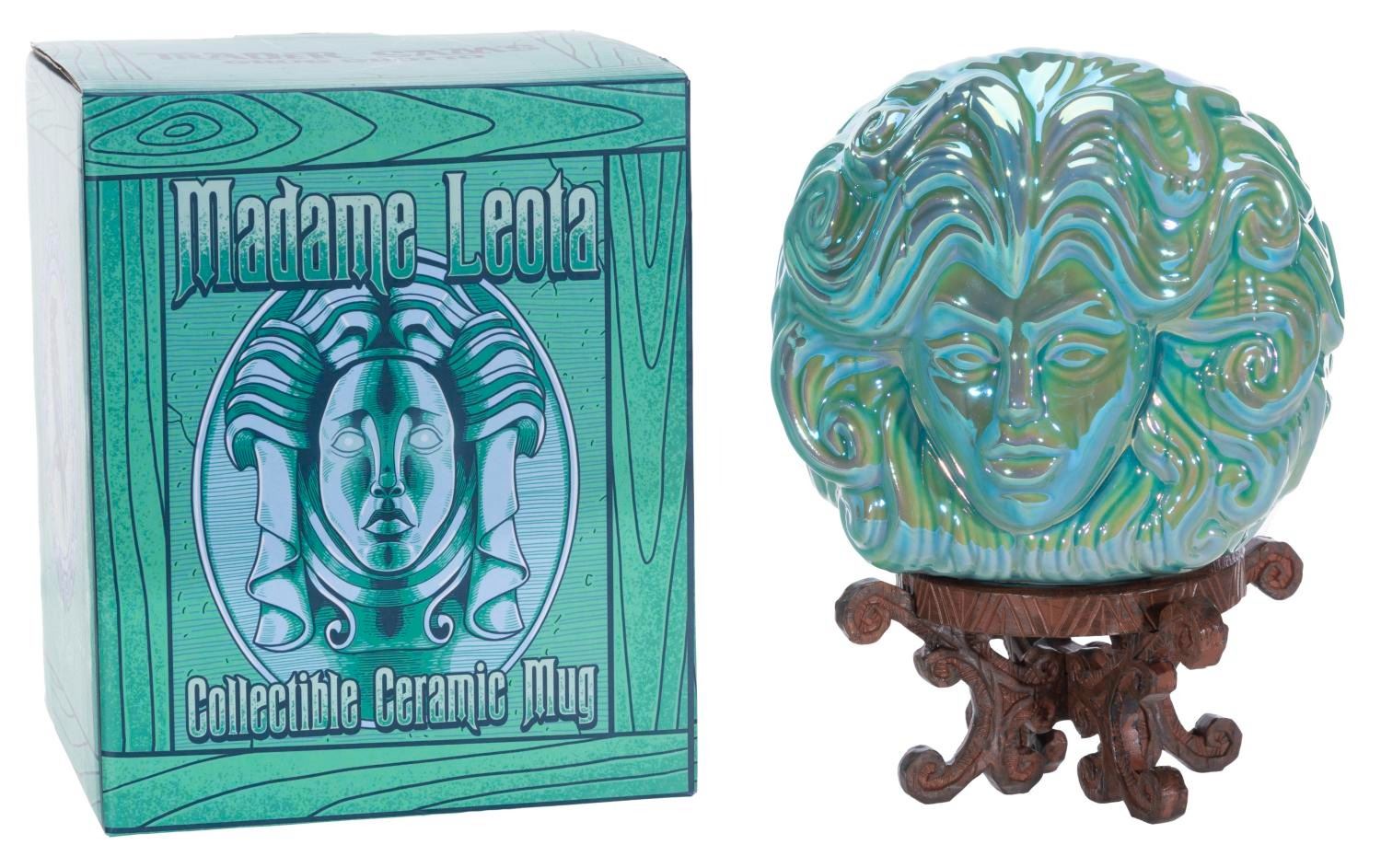 (Disney’s California Adventure, 2024) A first edition tiki mug of Madame Leota from the Haunted Mansion attraction. The mug with a stand was designed by Tank Standing Buffalo as part of a Disney Artist Showcase at the 1901 Lounge at the Carthay Circle Restaurant. Measuring 5.25" in diameter x 6.75" tall, the mug and stand are in fine condition, with the original box.