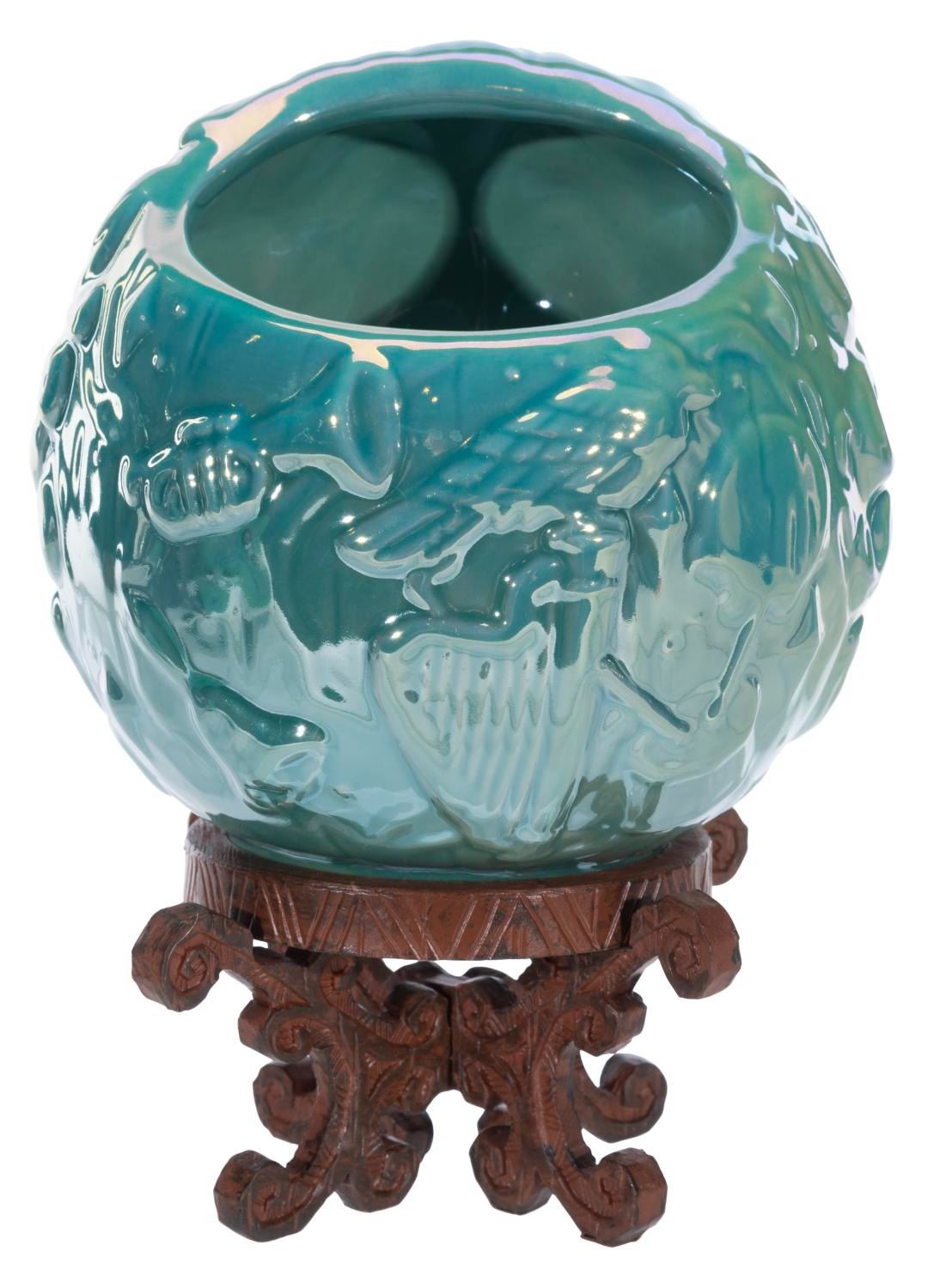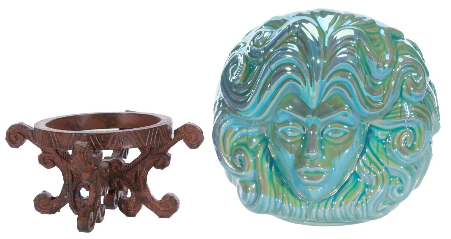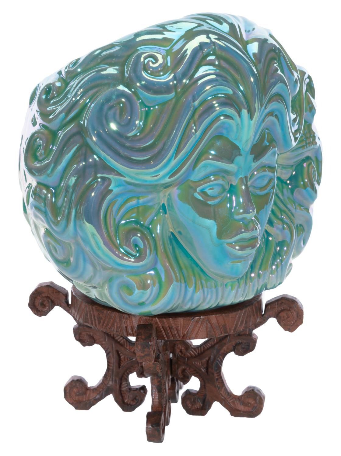 (Disney’s California Adventure, 2024) A first edition tiki mug of Madame Leota from the Haunted Mansion attraction. The mug with a stand was designed by Tank Standing Buffalo as part of a Disney Artist Showcase at the 1901 Lounge at the Carthay Circle Restaurant. Measuring 5.25" in diameter x 6.75" tall, the mug and stand are in fine condition, with the original box.