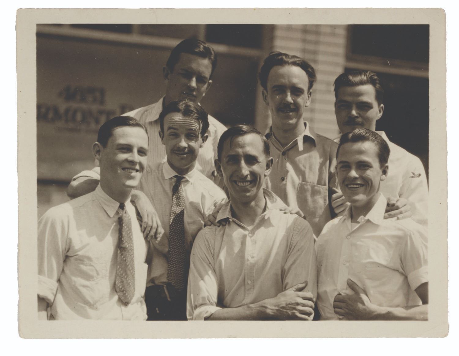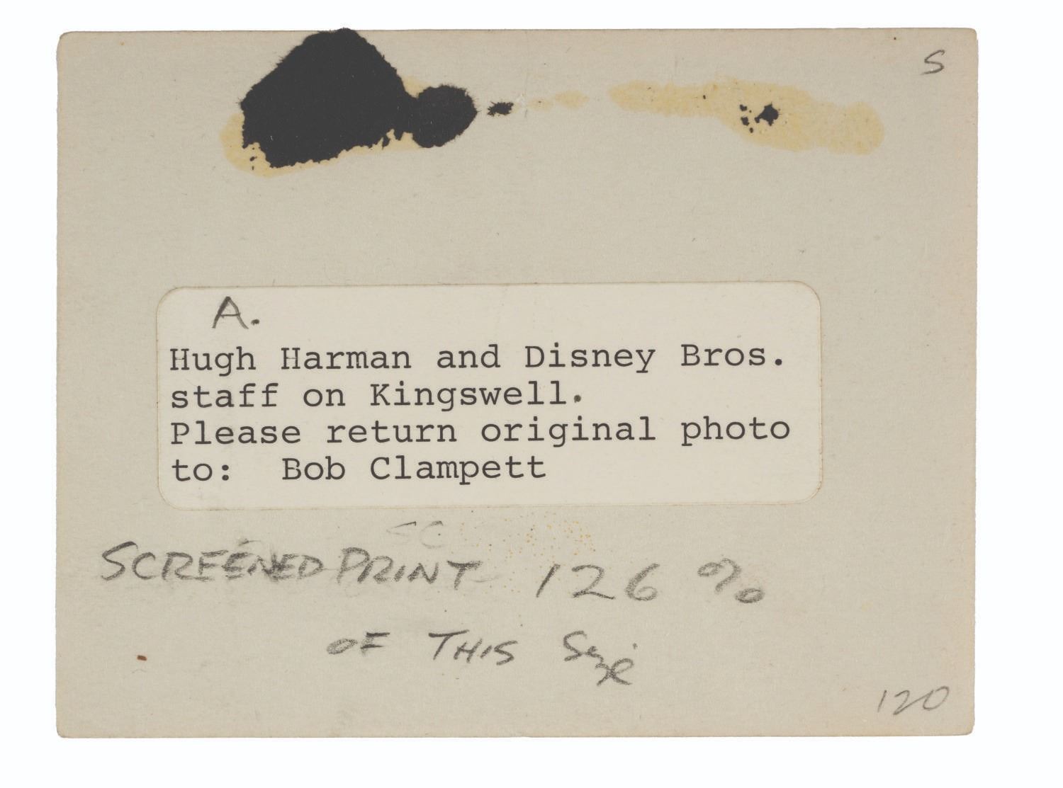 (Disney, 1925) A rare original photo of the staff at the Kingswell Street headquarters of the Disney Bros. Studio in 1925. Pictured are Rudy Ising, Hugh Harman, Ub Iwerks, Ham Hamilton, Roy Disney, Thurston Harper, and Walker Harman. The 4” x 3” photo is in good condition with some residue on the reverse from being mounted in a scrapbook. The reverse also has a label with a description and some reproduction instructions.