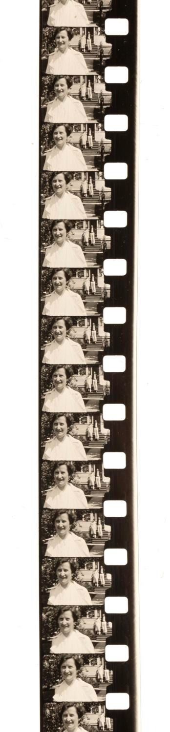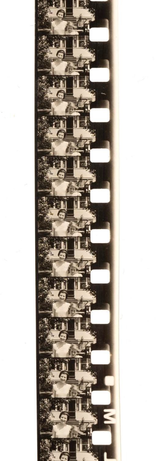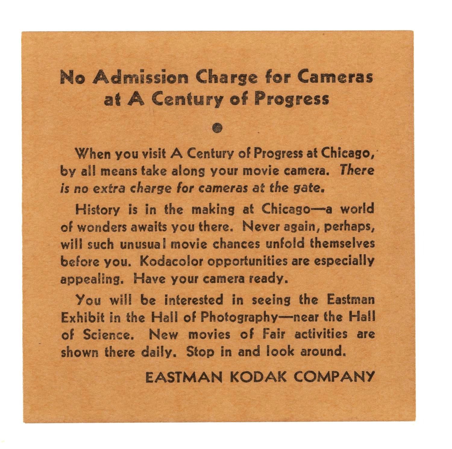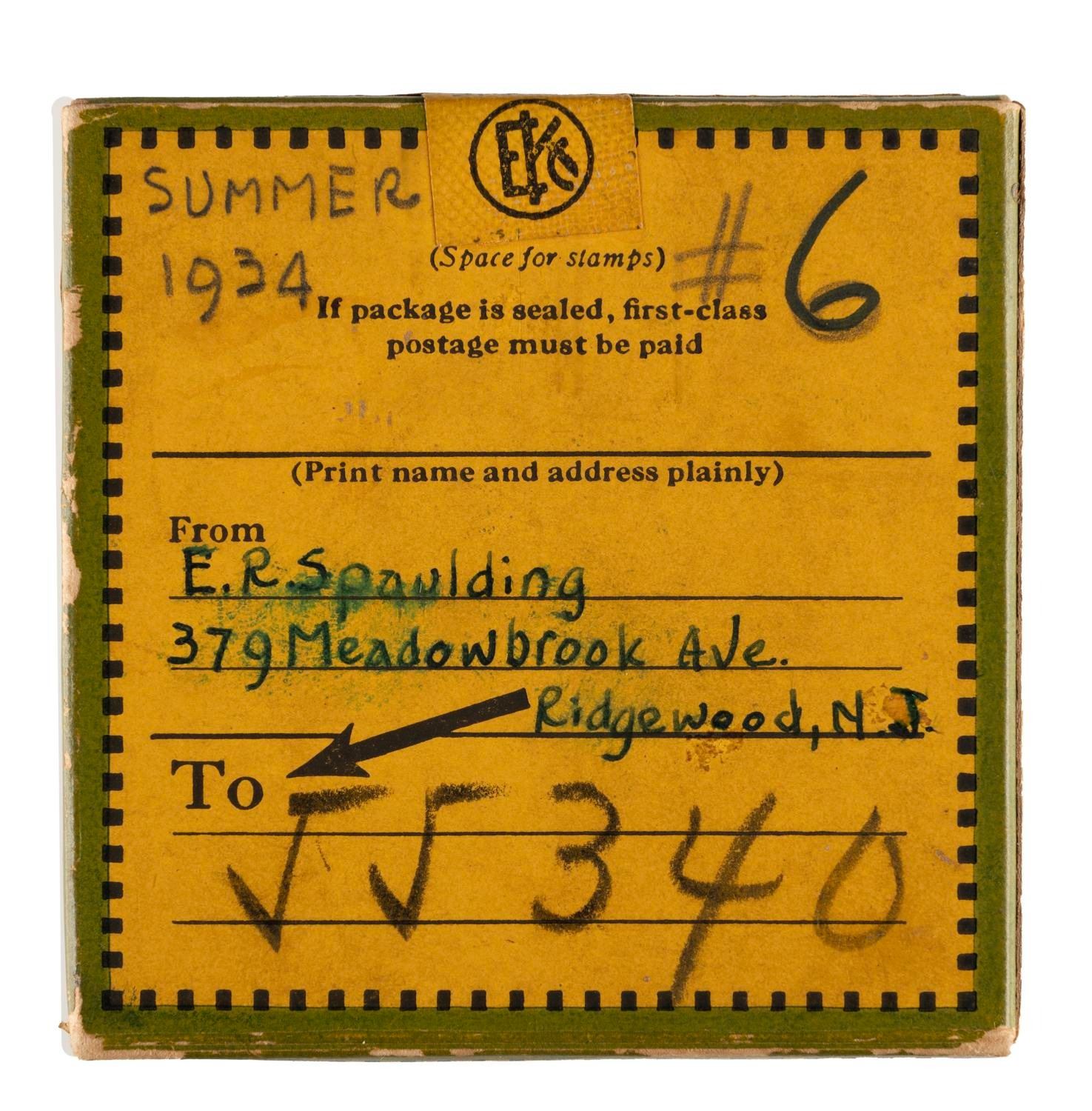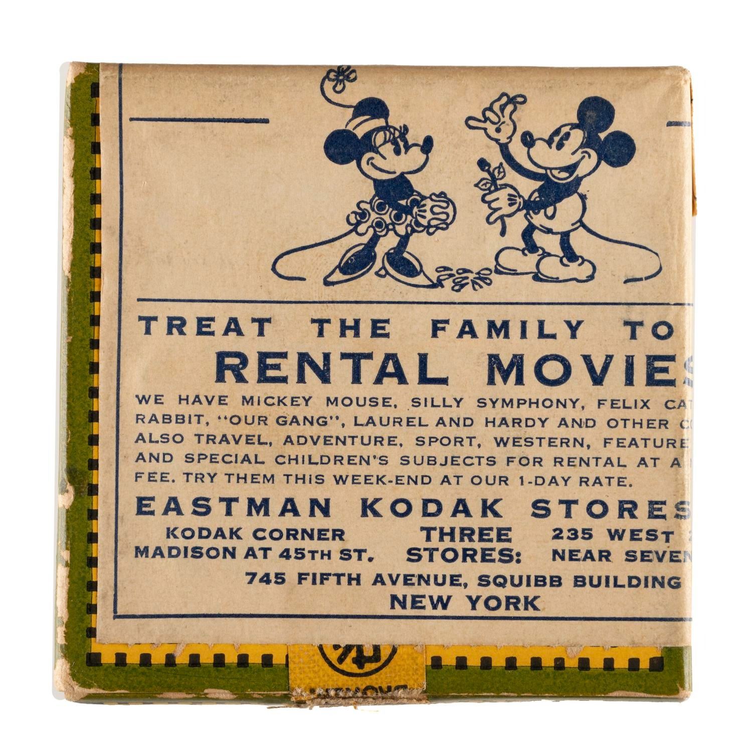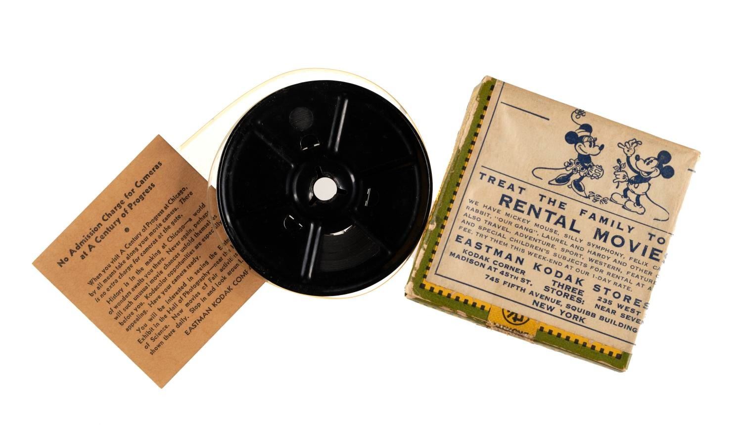 (Kodak, 1930s) A Kodak 16mm film processing box, with a label advertising Mickey Mouse cartoons available for rental. This very early predecessor of home video targeted customers with an offer to rent Mickey Mouse cartoons and other short subjects. The box with Mickey label measures 3" x 3" x 1" and is in very good condition with expected wear and writing, containing a 16mm home movie labeled "Summer 1934."