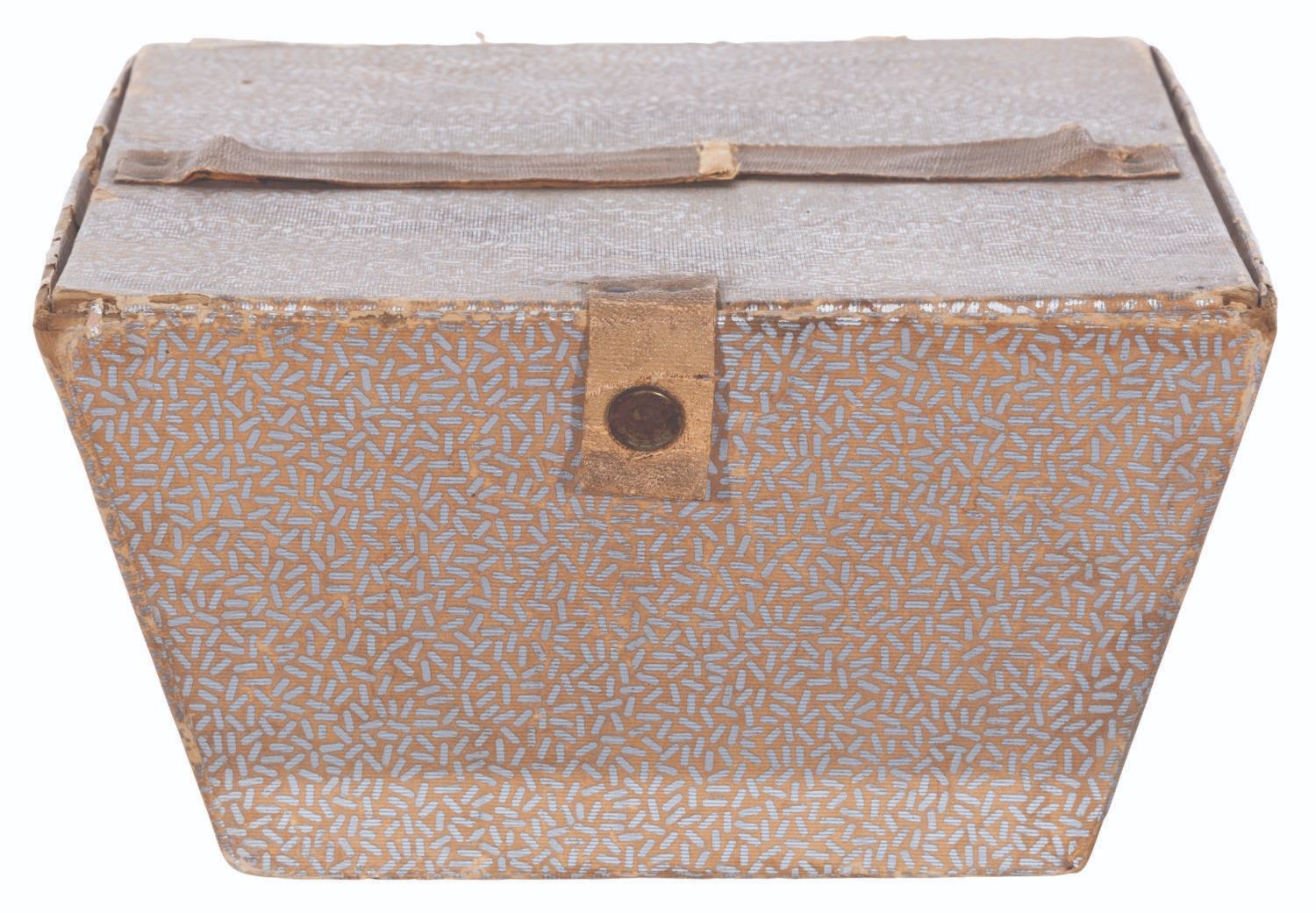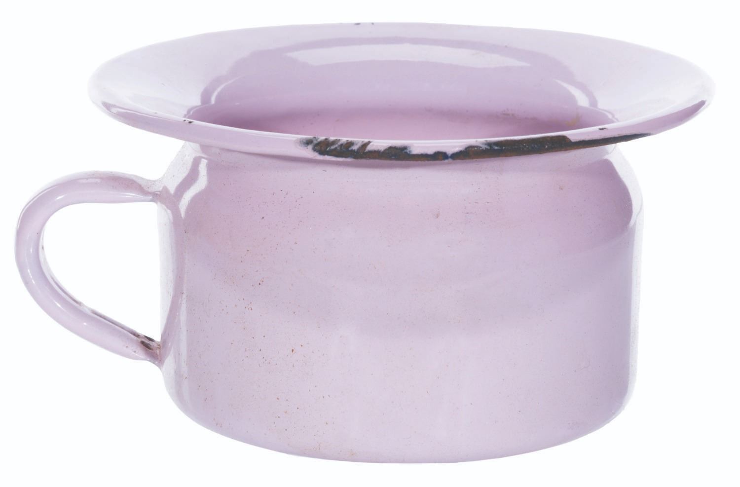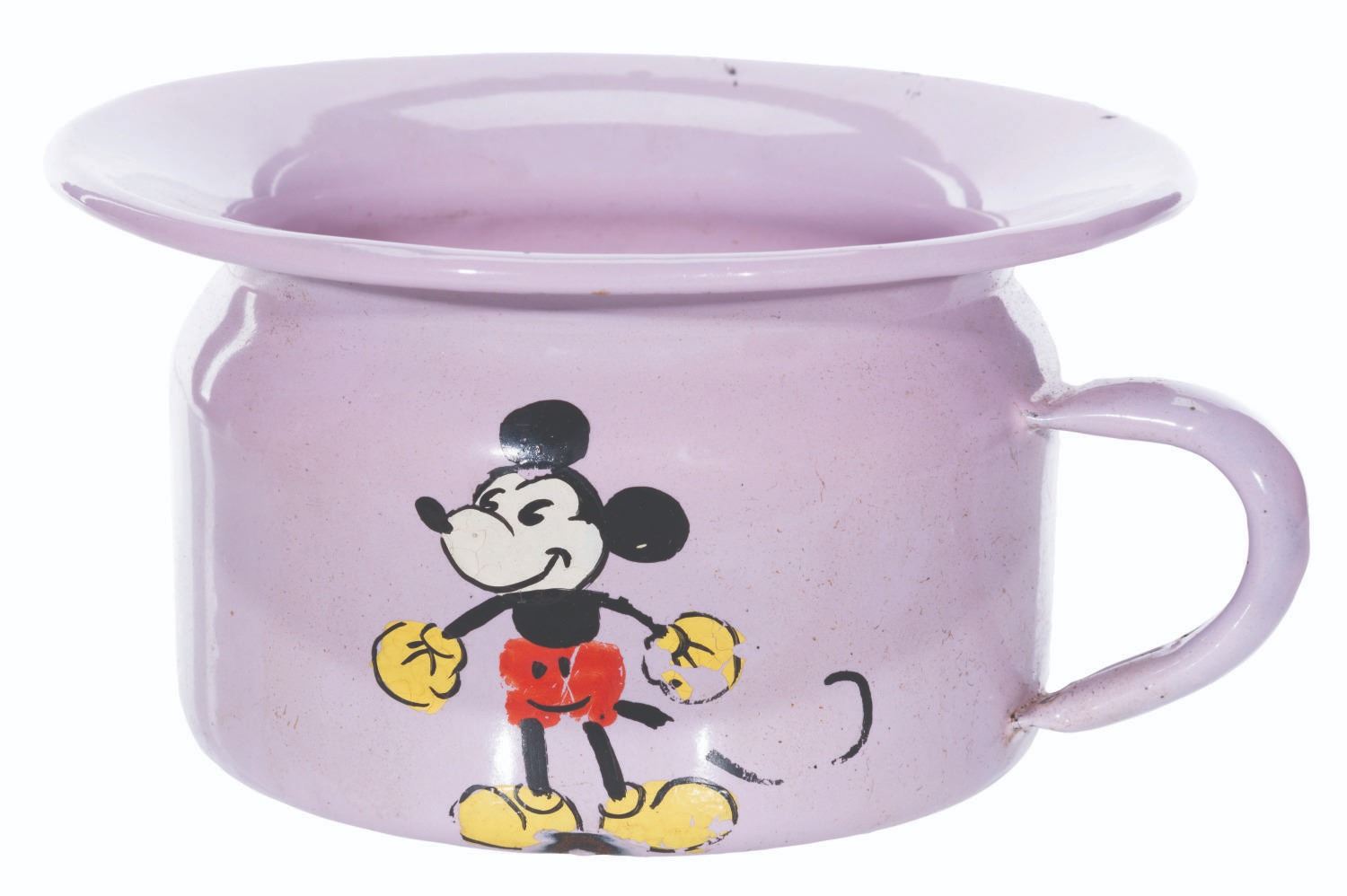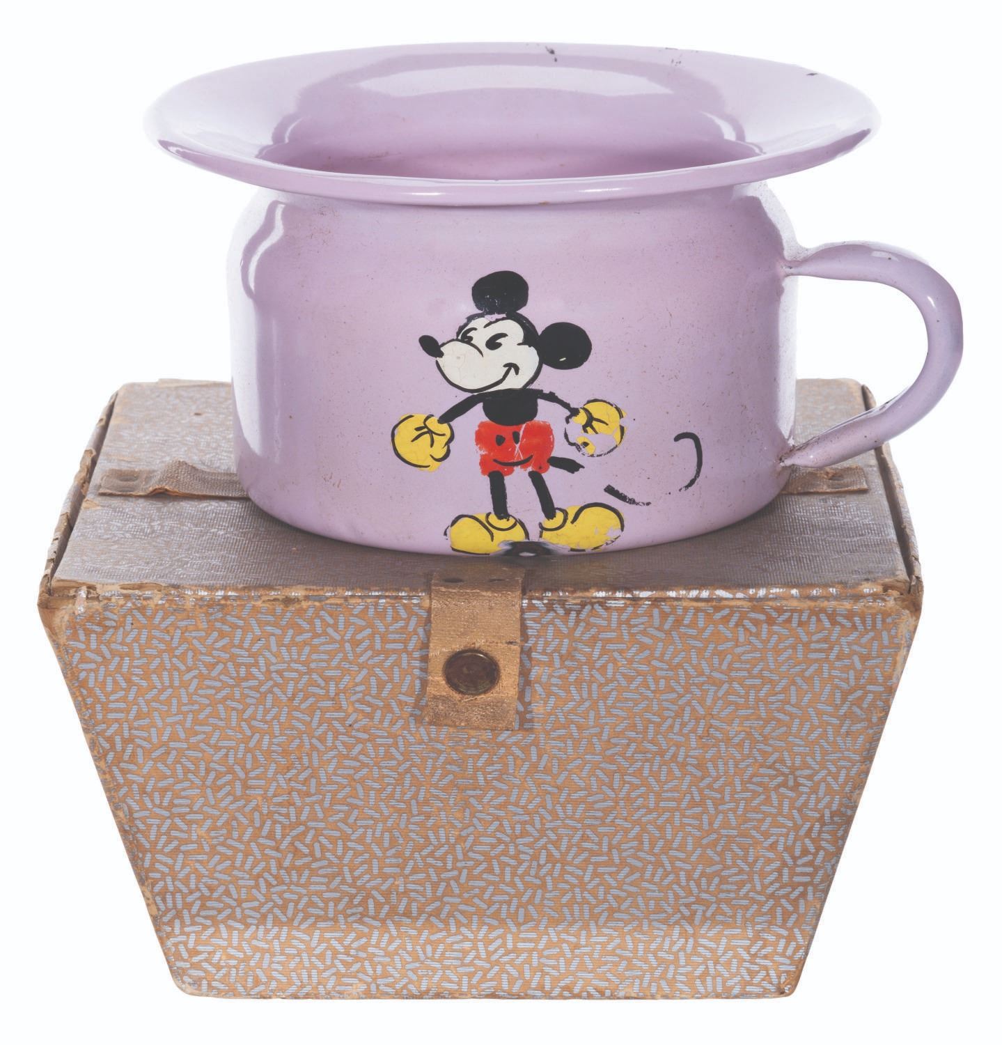 (Krueger, 1930s) A rare 1930s Mickey Mouse child's potty, manufactured by Krueger of Germany. Measuring 6” in diameter and 3” tall with its original 6.75” x 6.75” x 3.75” tall travel box, the enamelware potty is in good condition with paint loss, scuffs, wear, and oxidation from age.
