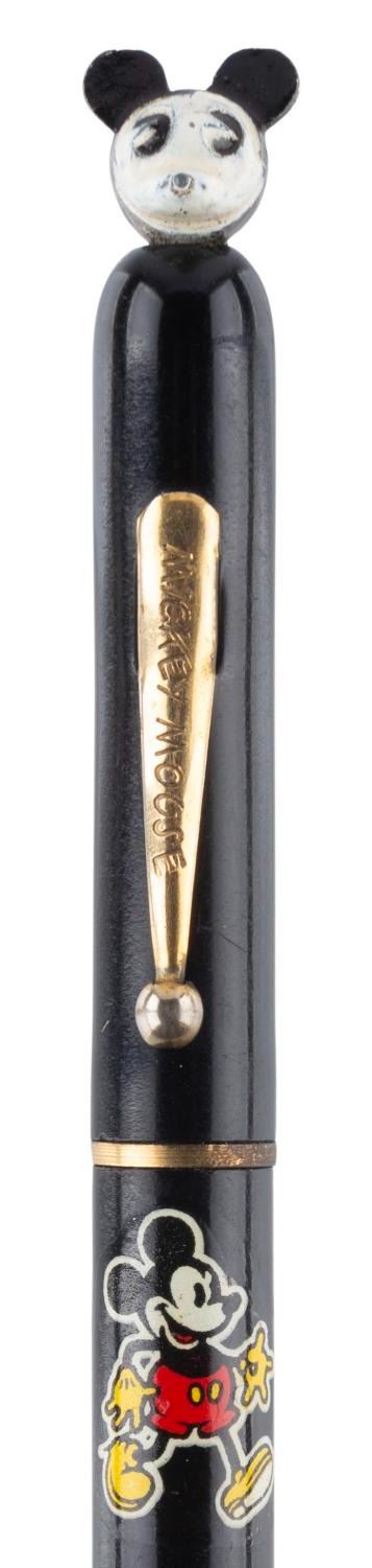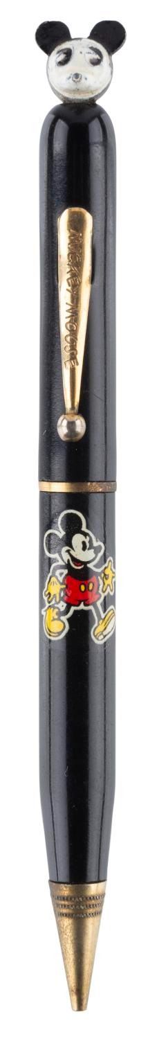 (Inkograph, 1930s) A mechanical pencil featuring Mickey Mouse on the side and a figural Mickey head at the top. The inside of the pencil is empty, so it has not been tested for function. Measuring 5” long, the mechanical pencil displays in very good condition with scratches, wear, light oxidation, and paint loss from age.