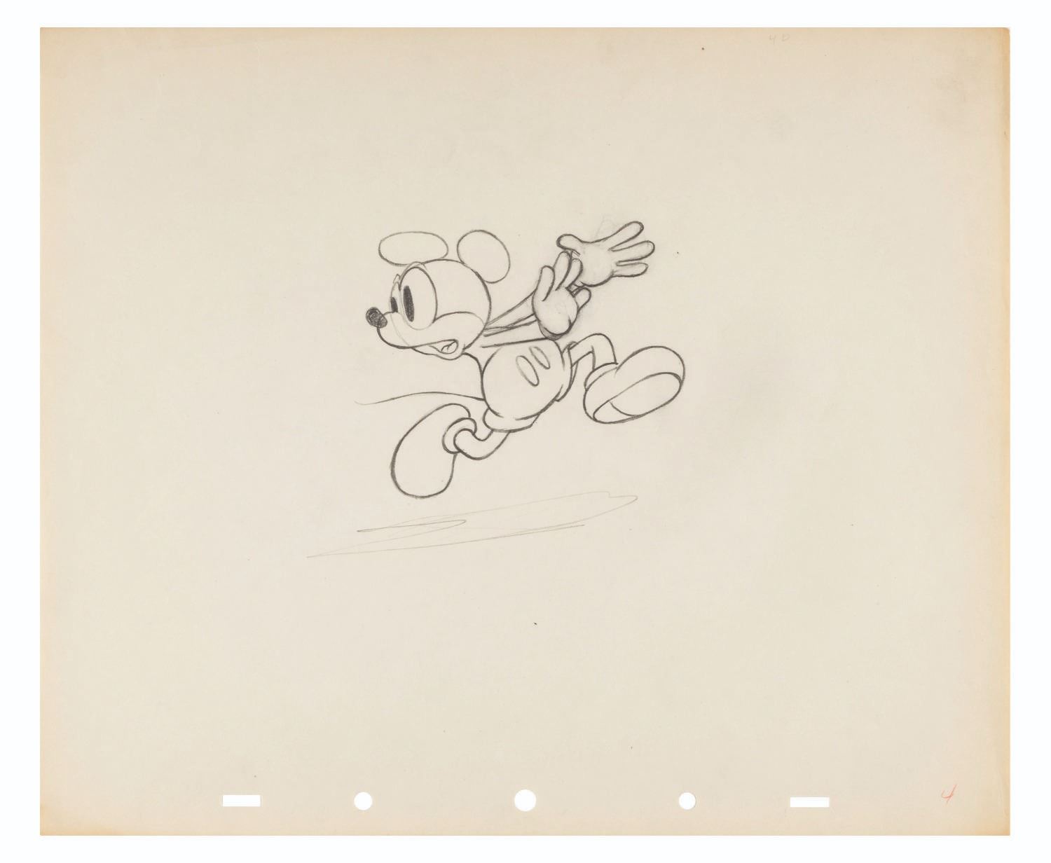 (Disney, 1930s) An original production drawing of Mickey Mouse from an unknown mid-1930s short. The image of Mickey measures 4” x 3.25” on untrimmed 5-peg 12” x 10” animation paper. The drawing is in very good condition with only light wear from age.