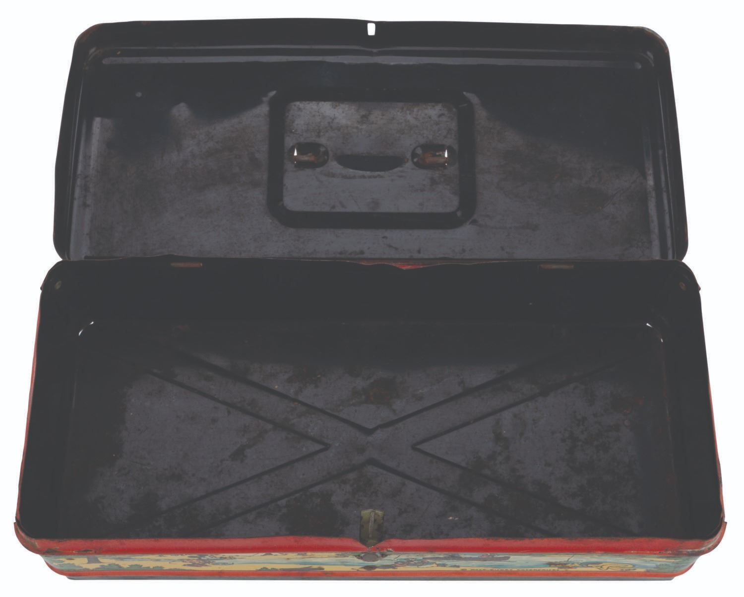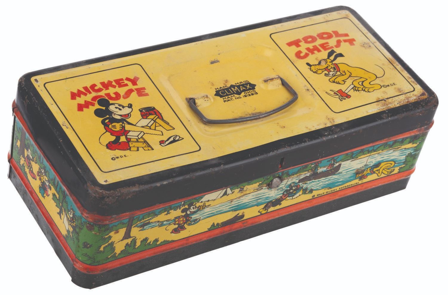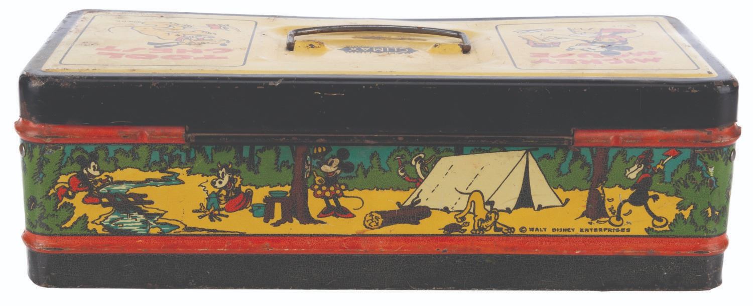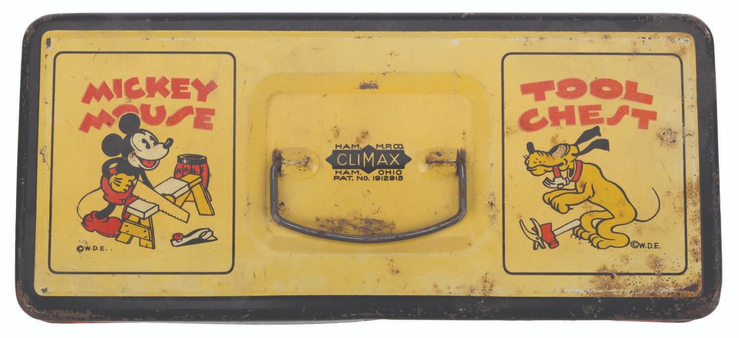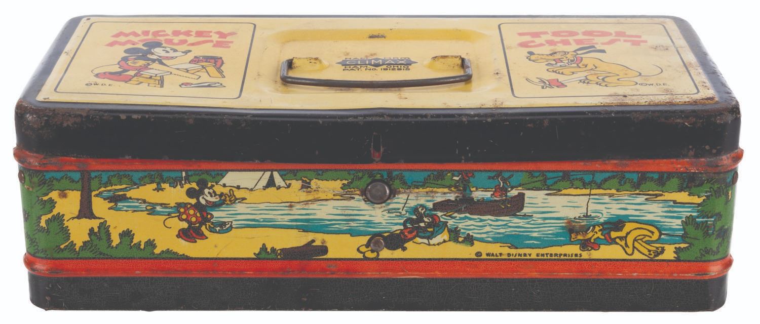 (Ham M.P. Climax, 1930s) A tin litho Mickey Mouse tool chest featuring early depictions of Mickey, Minnie, Pluto, Goofy, Donald Duck, and Horace Horsecollar. Measuring 11.5" x 5" x 4" tall, the chest is in fair condition with heavy oxidation, crazing, discoloration from age, and wear.