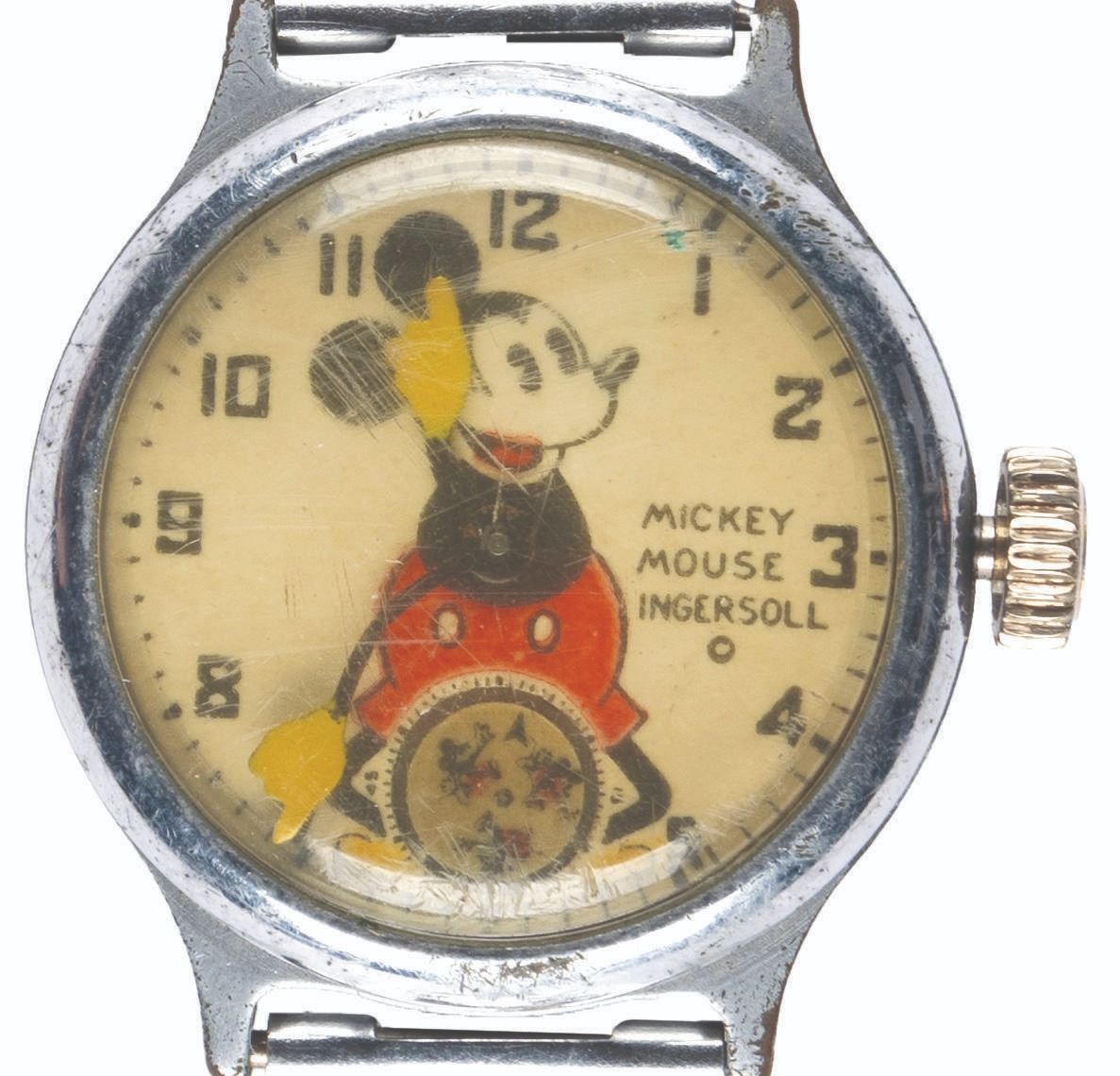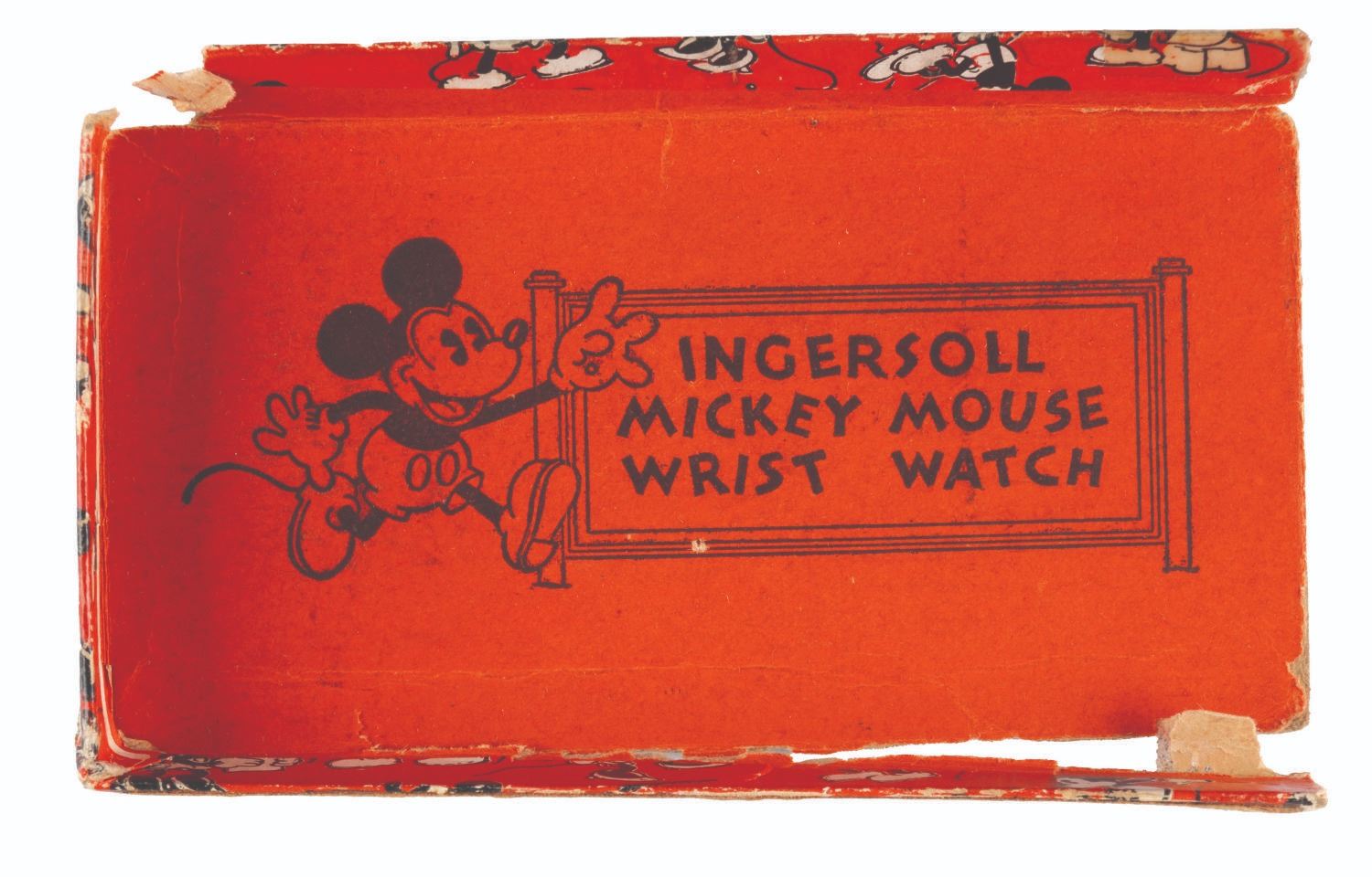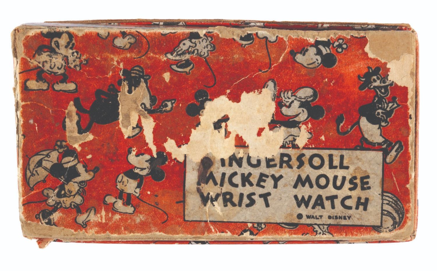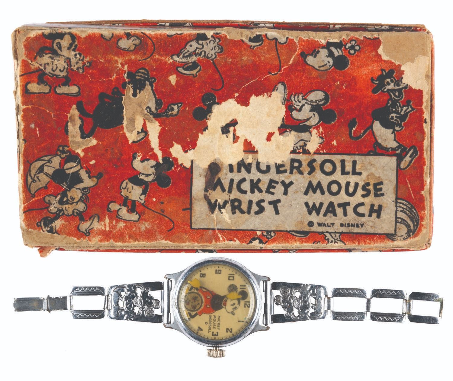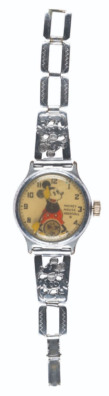 (Ingersoll, 1930s) An Ingersoll Mickey Mouse watch. Mickey’s arms act as the watch’s hands and three smaller Mickeys chase each other in a circle. The watch, with its original 2.5” x 4.75” box included, has been shortened by a previous owner and requires maintenance to work. Measuring 6” with a 1” in diameter face, the watch is in good condition with discoloration from age, heavy scratches on the face, smudges, and wear.