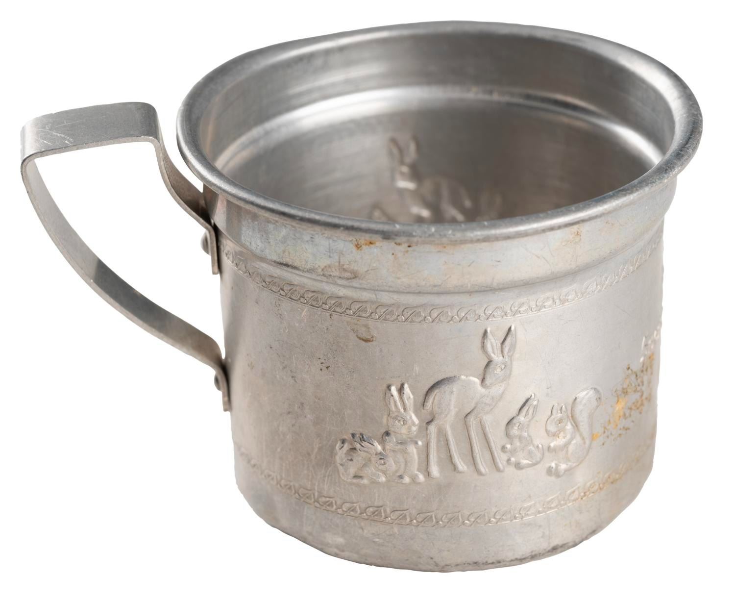 (Disney, 1930s) An early tin cup with embossed reliefs of Snow White and her forest animal friends. Measuring 2.5" tall and 3" in diameter, the cup is in very good condition with dents and wear.