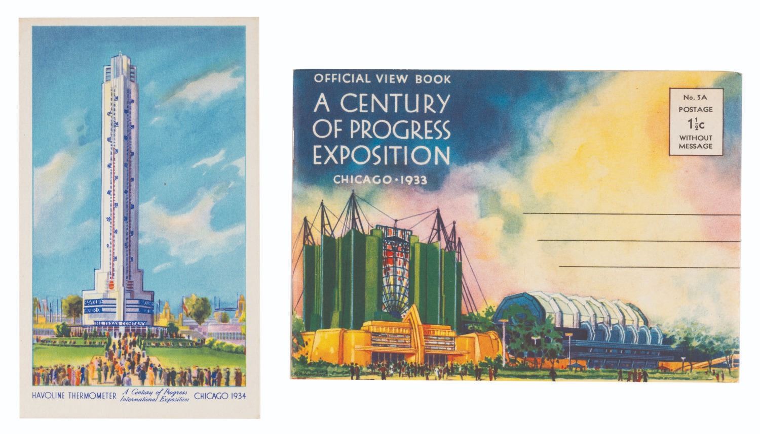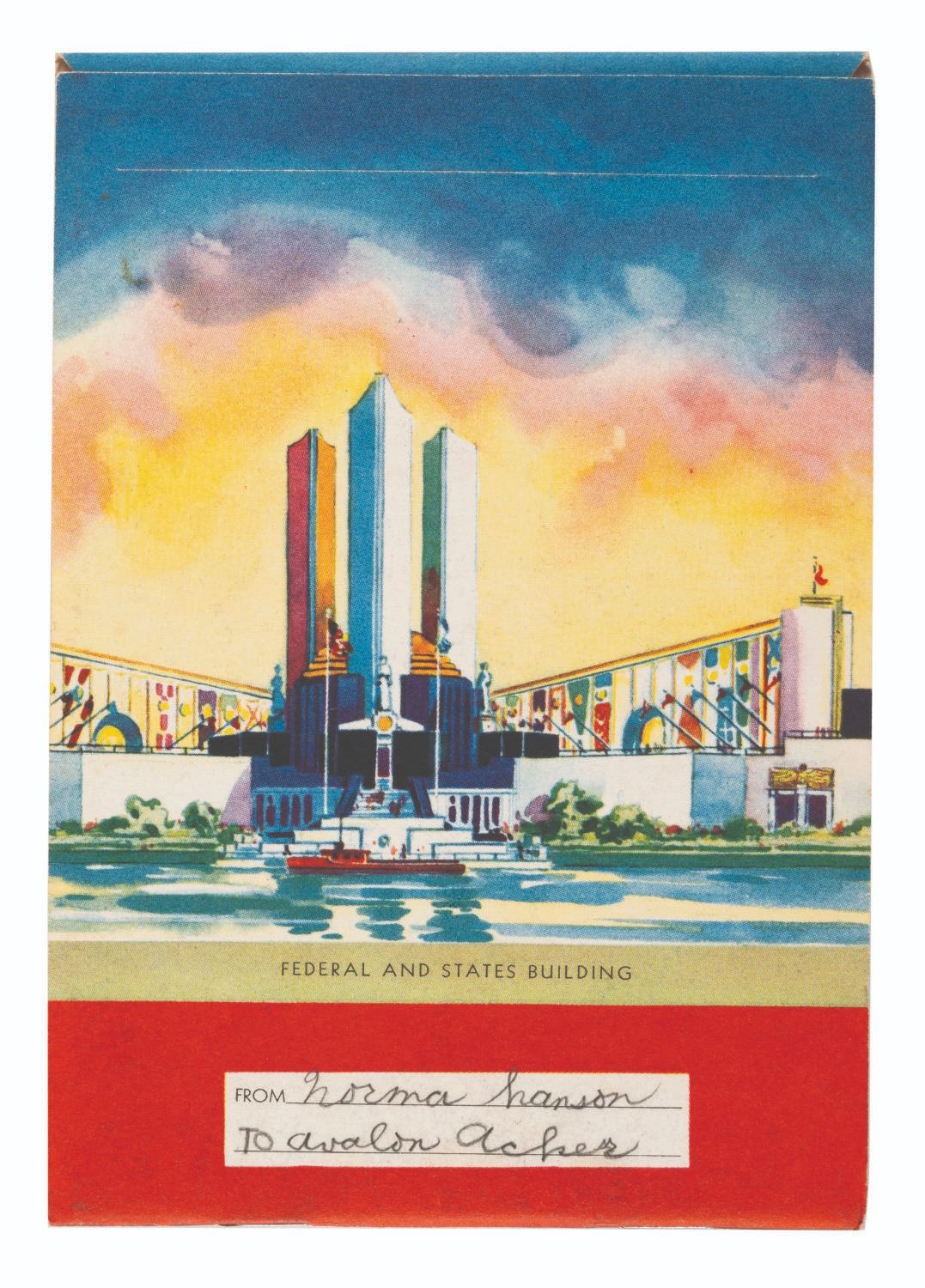 (World’s Fair, 1933-1934) A Century of Progress Exposition view book and postcard. The 17-page view book features gorgeous illustrations of the buildings and pavilions at the fair. The postcard features the Havoline Thermometer, the world’s tallest thermometer, created for the fair by Havoline Motor Oil. Measuring 4.5” x 6.25”, the view book is in very good condition with light discoloration from age. The back of the envelope is addressed “From Norma Hanson to Avalon Acker” in pencil. Measuring 3.5” x 5.5”, the postcard is in very good condition with some discoloration and black spots on the front.