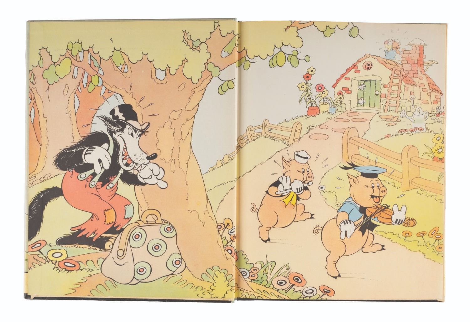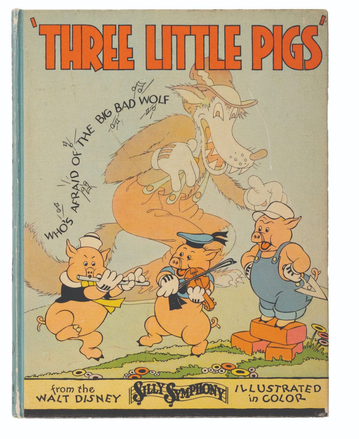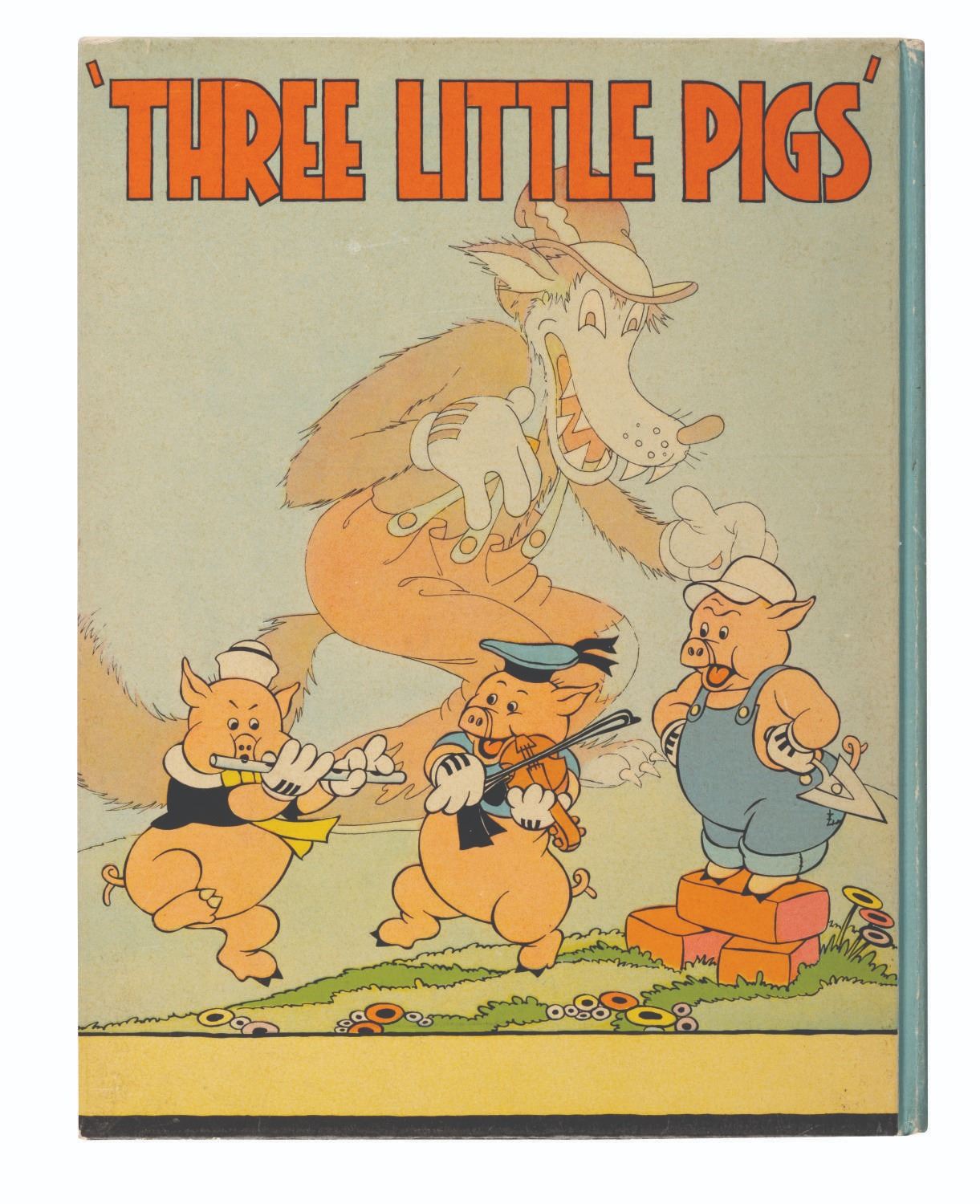 (Disney, 1933) A Three Little Pigs hardcover book with color illustrations. A handwritten note on the title page reads “Given to Bob Clampett by Carl Stalling’s niece - 1981.” Measuring 8” x 10.25”, the book is overall in very good condition, with typical wear to the cover from age and handling, slight paper loss along spots of the spine, and interior pages in fine condition.