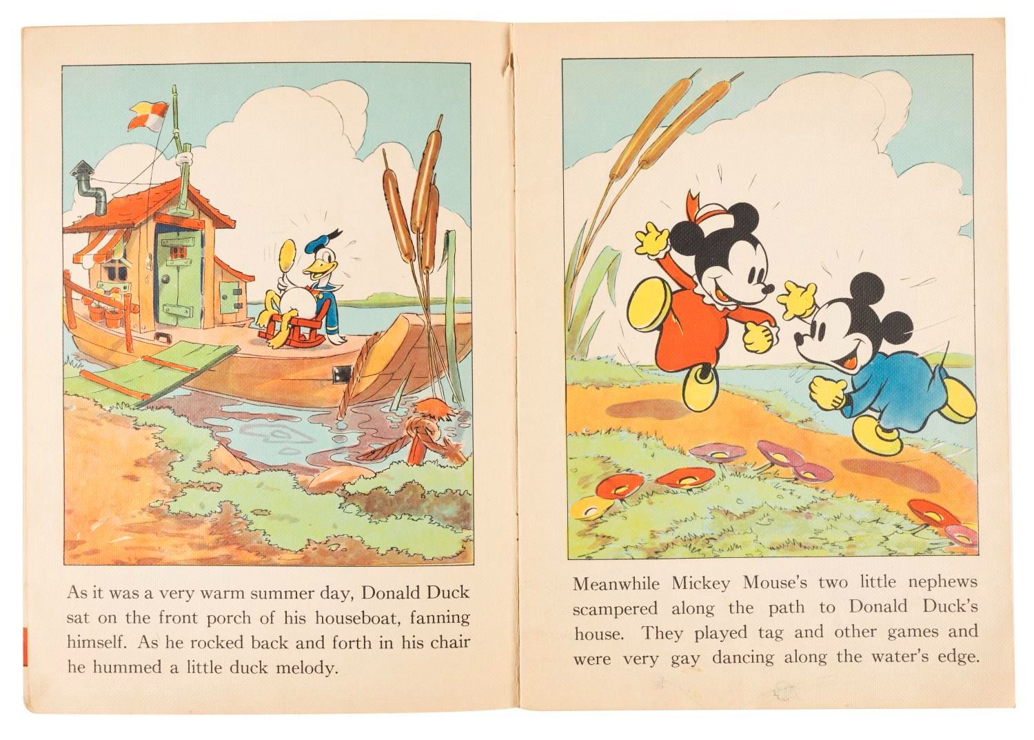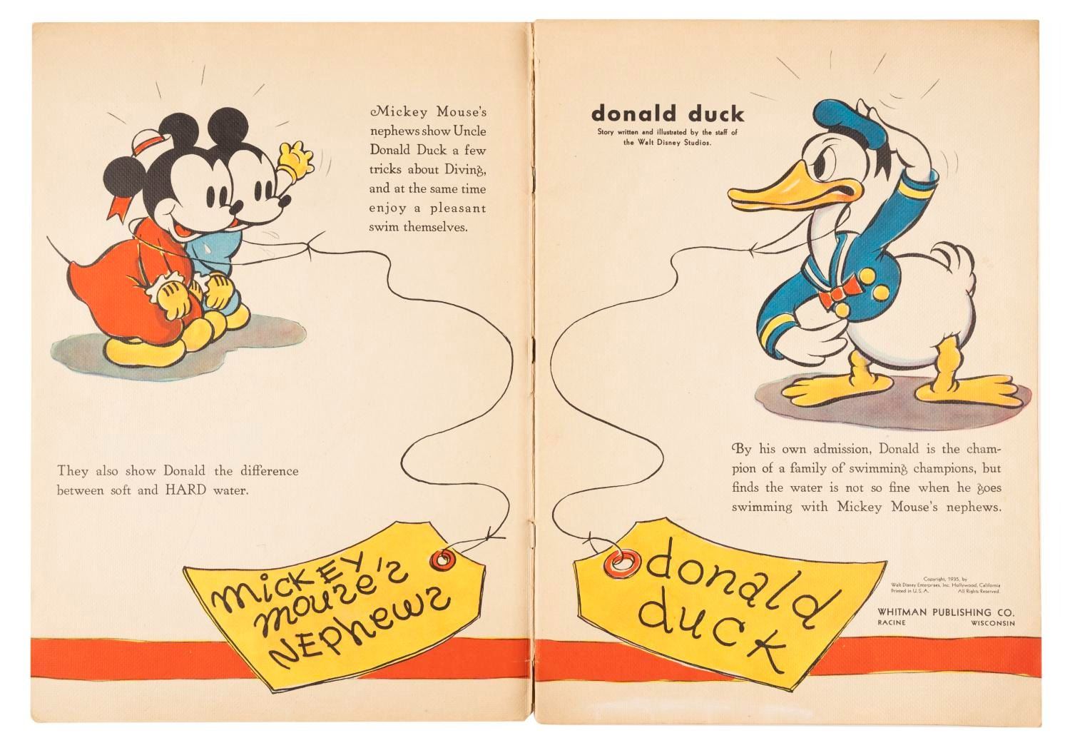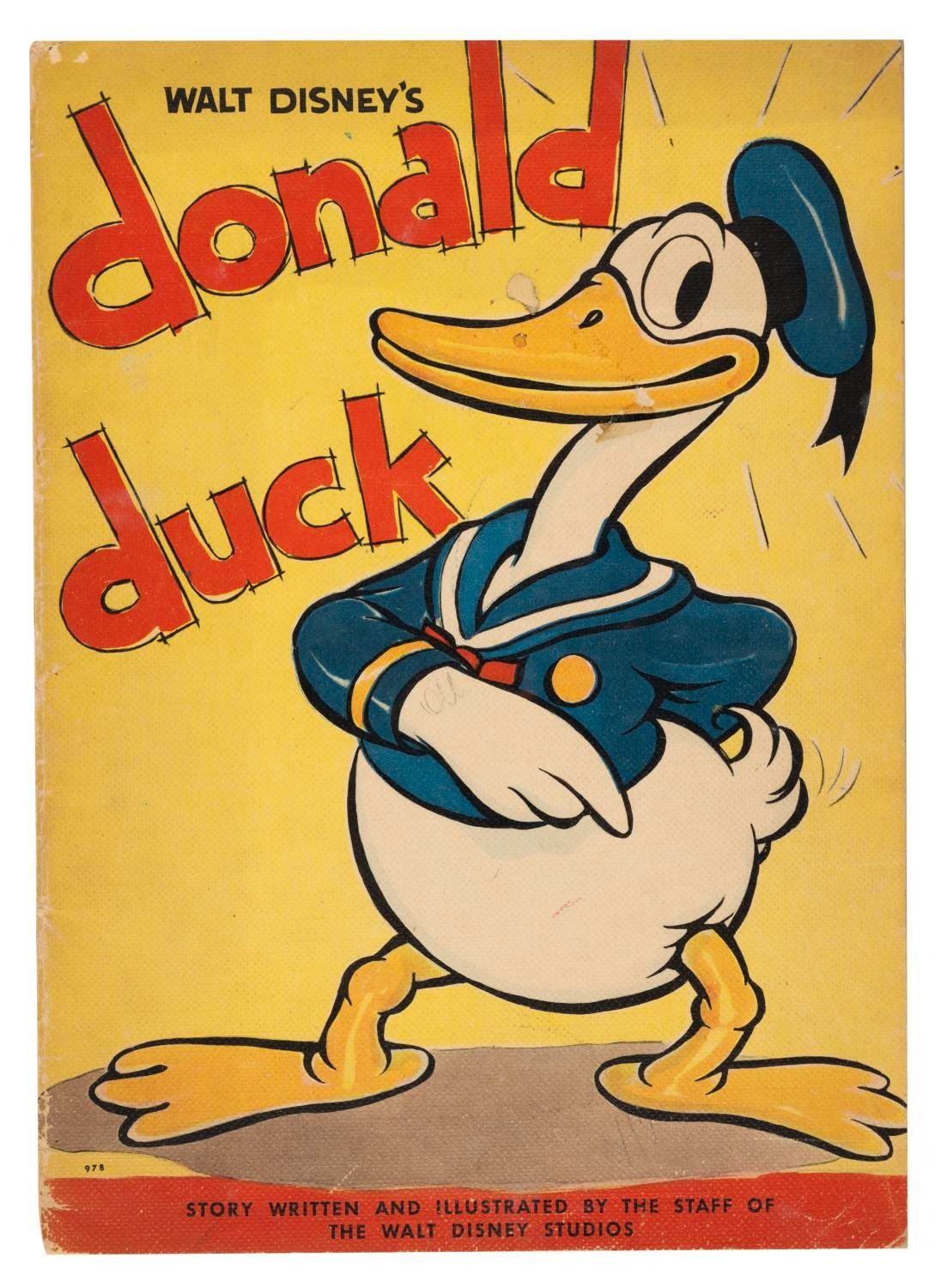 (Whitman, 1935) A Donald Duck book by Whitman Publishing. The Walt Disney's Donald Duck Book was manufactured of durable"linen-like" material and is a perfect example of the work produced during Kay Kaymen's outstanding tenure as Merchandise Director for Walt Disney. Measuring 9.25" x 13", the book is in very good condition with wear to the cover and spine, including scuffs, soiling, and slight paper loss.
