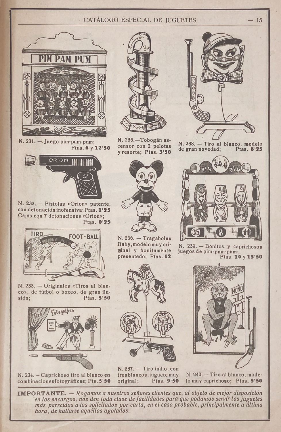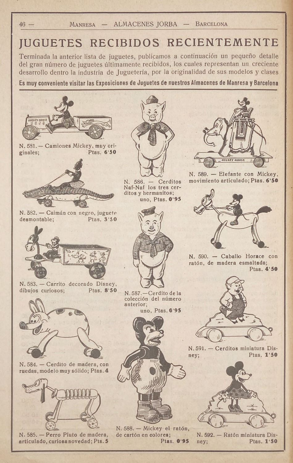 (Jorba, 1935) A vintage catalog for the Spanish department store Jorba featuring many rare Disney toys. The 56-page printed catalog contains rare appearances of scarcely-seen early Disney merchandise, such as Spanish versions of Marx classics, Mickey pull-toys, target sets, figures, and much more, among other non-Disney offerings. This is the only such catalog known to feature these Disney toys from this era, and perhaps the last great compendium of Spanish toys of the 1930s. Measuring 11” x 7.5”, the catalog is in very good condition with some edge browning and minor splitting to the spine from wear. There is a stamp and signature on the interior title page that is attributed to its original use.