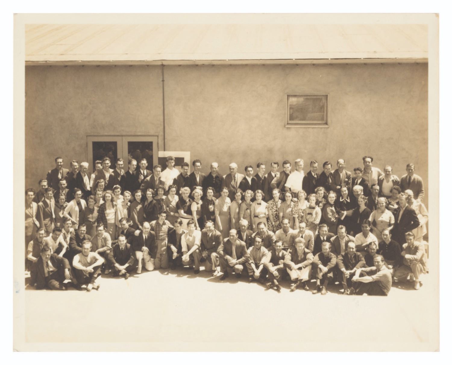 (Schlesinger, 1936) A photo of Leon Schlesinger’s Warner Brothers Cartoon staff taken April 6th, 1936. Bob Clampett wrote the date on the back, including that the photo “was being taken as I had to rush off to my Dad’s funeral at Forest Lawn. As I pulled out in my car, they all waved to me conveying a feeling of sympathy and encouragement which meant a great deal to me at this very sad moment.” Measuring 8” x 10”, the photo print is in very good condition with light edge wear and toning.