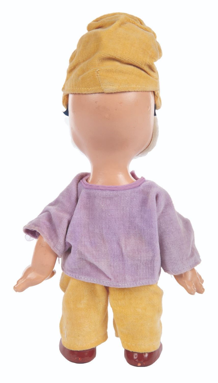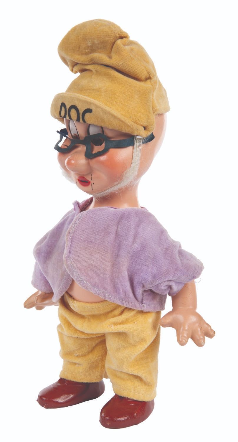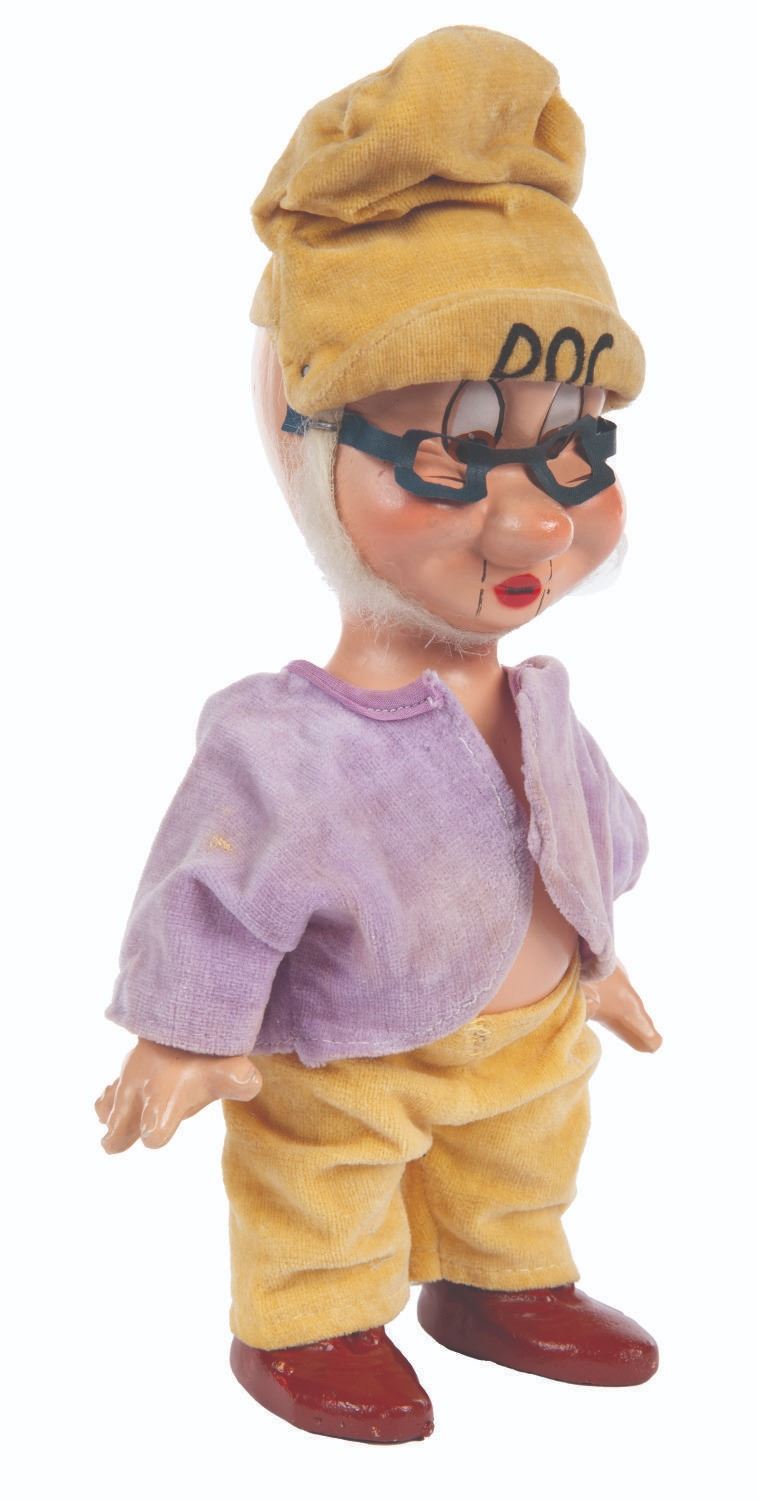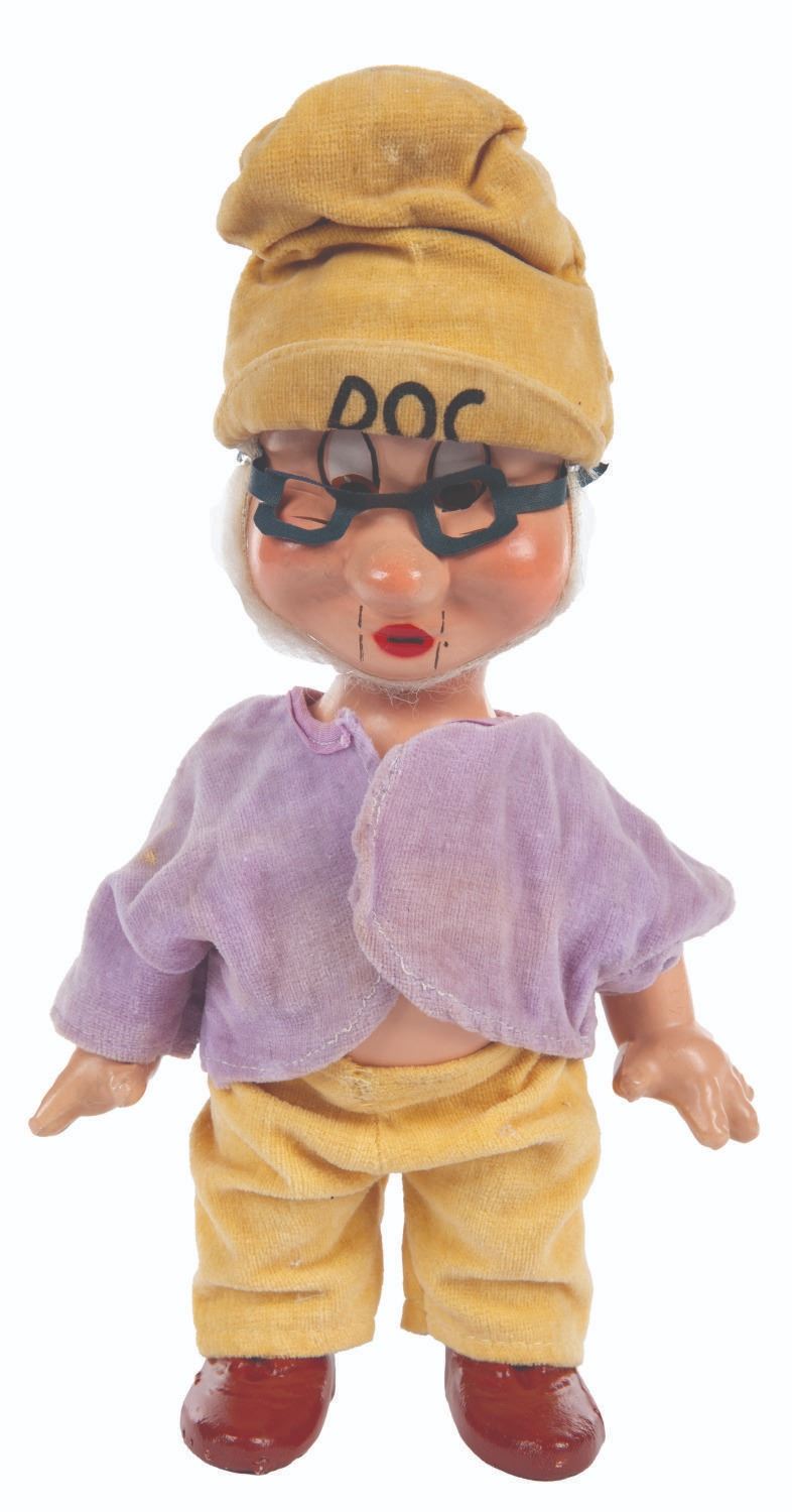 (Knickerbocker, 1938) A "Snow White and the Seven Dwarfs" Doc Composition Doll by the Knickerbocker Toy Company. Doc is accented with hand-painted features, cloth clothing, and mohair elements. Measuring 9.5" tall and 6" wide, the figure displays in good condition, with some wear and missing the leather belt.