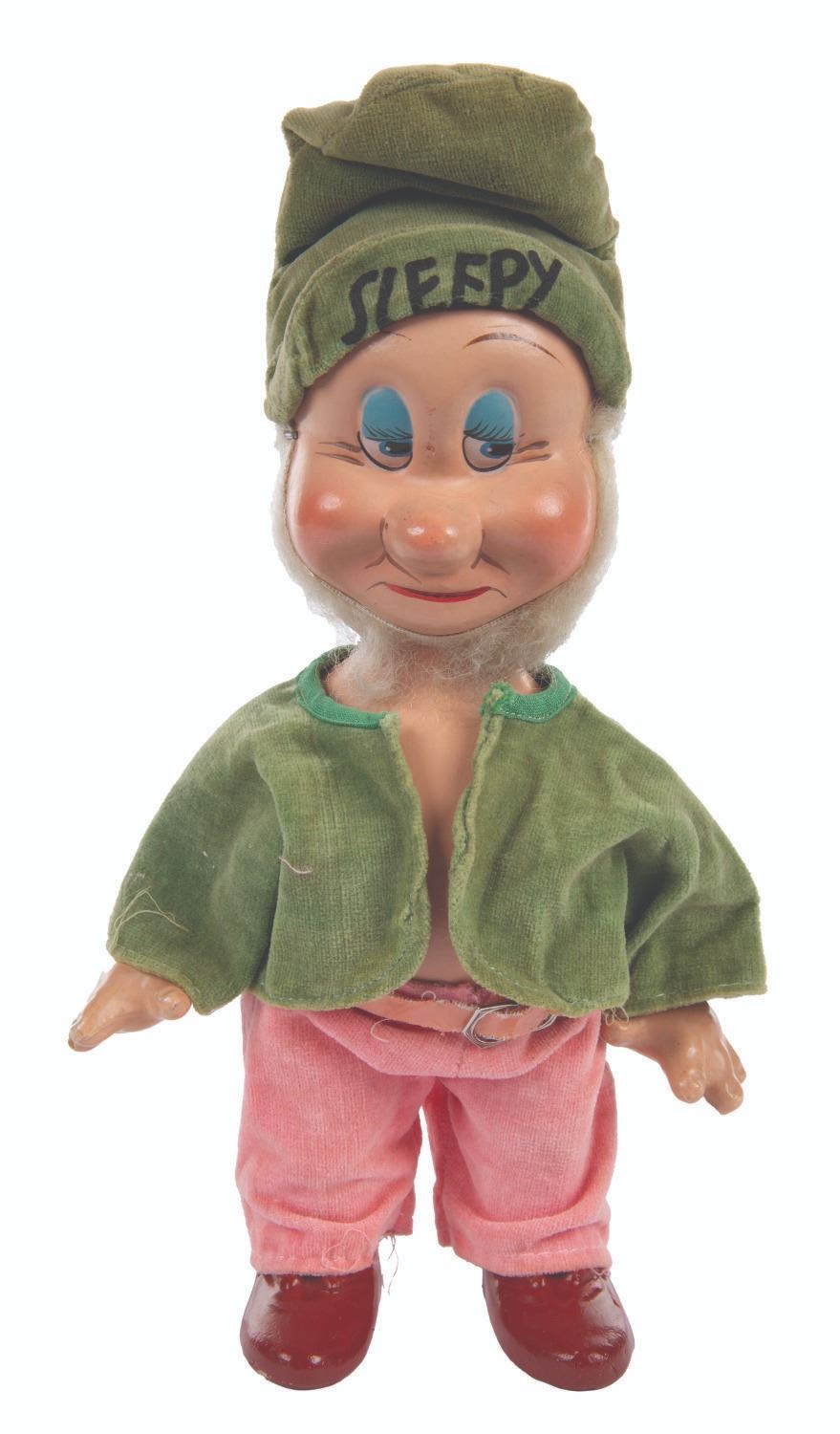 (Knickerbocker, 1938) A “Snow White and the Seven Dwarfs” Composition Sleepy doll. Sleepy is accented with hand-painted features, cloth clothing, and mohair elements. Measuring 9.5" tall and 6" wide, the figure displays in good condition, with some wear, and is missing the leatherette belt.