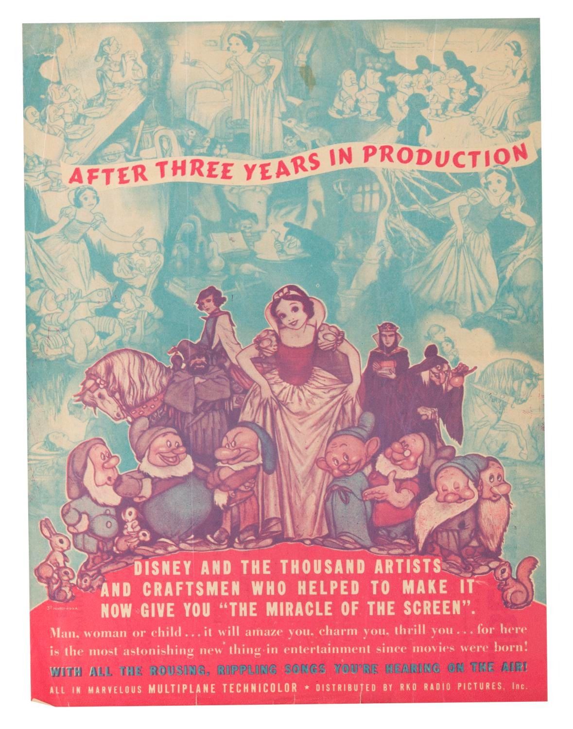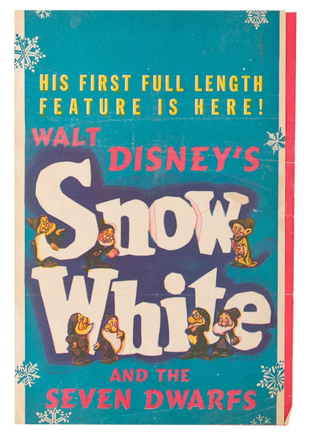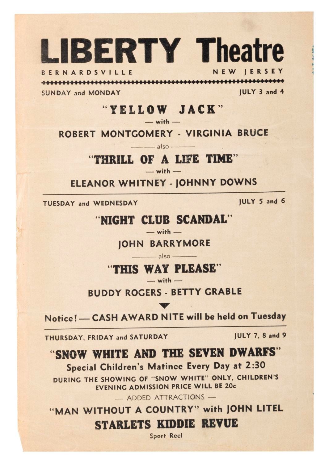 (Disney, 1938) A promotional flyer for “Snow White and the Seven Dwarfs" playing at the Liberty Theatre in Bernardsville, New Jersey. The July 3rd thru 9th theater schedule on the box attests that the film was still in theaters seven months after the December 1937 premiere. Measuring 6" x 9", the flyer is in good condition with wear including folds, a small stain, and small tears mainly along the right edge.