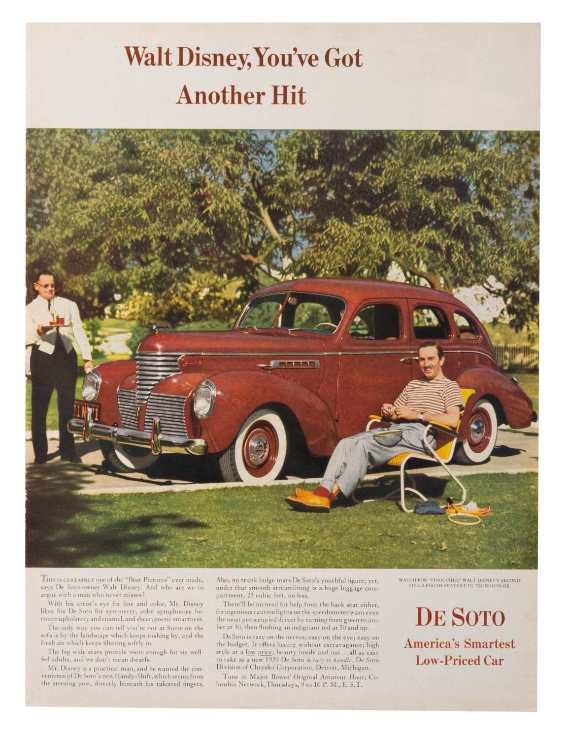 (De Soto, 1939) A rare magazine advertisement featuring Walt Disney himself endorsing a De Soto automobile. The ad makes note of "Pinocchio," Walt’s second full-length feature, coming soon to theaters. Measuring 10.5" x 14", the ad is in very good condition with light edge wear.
