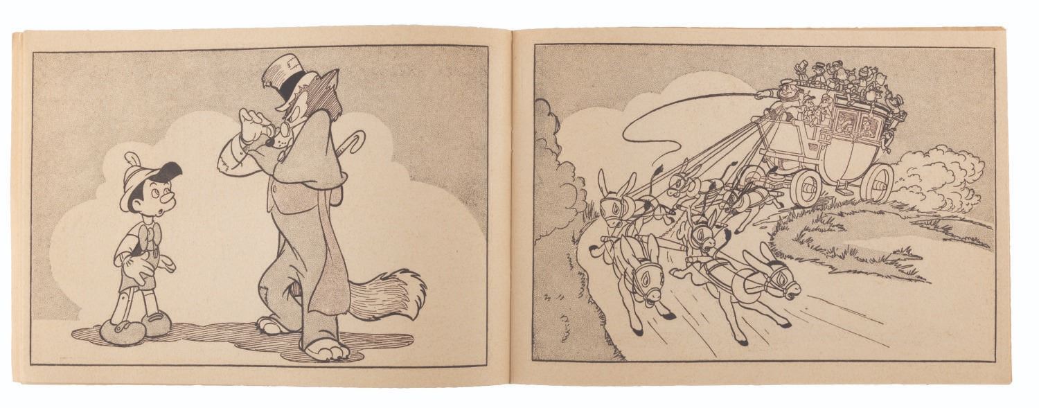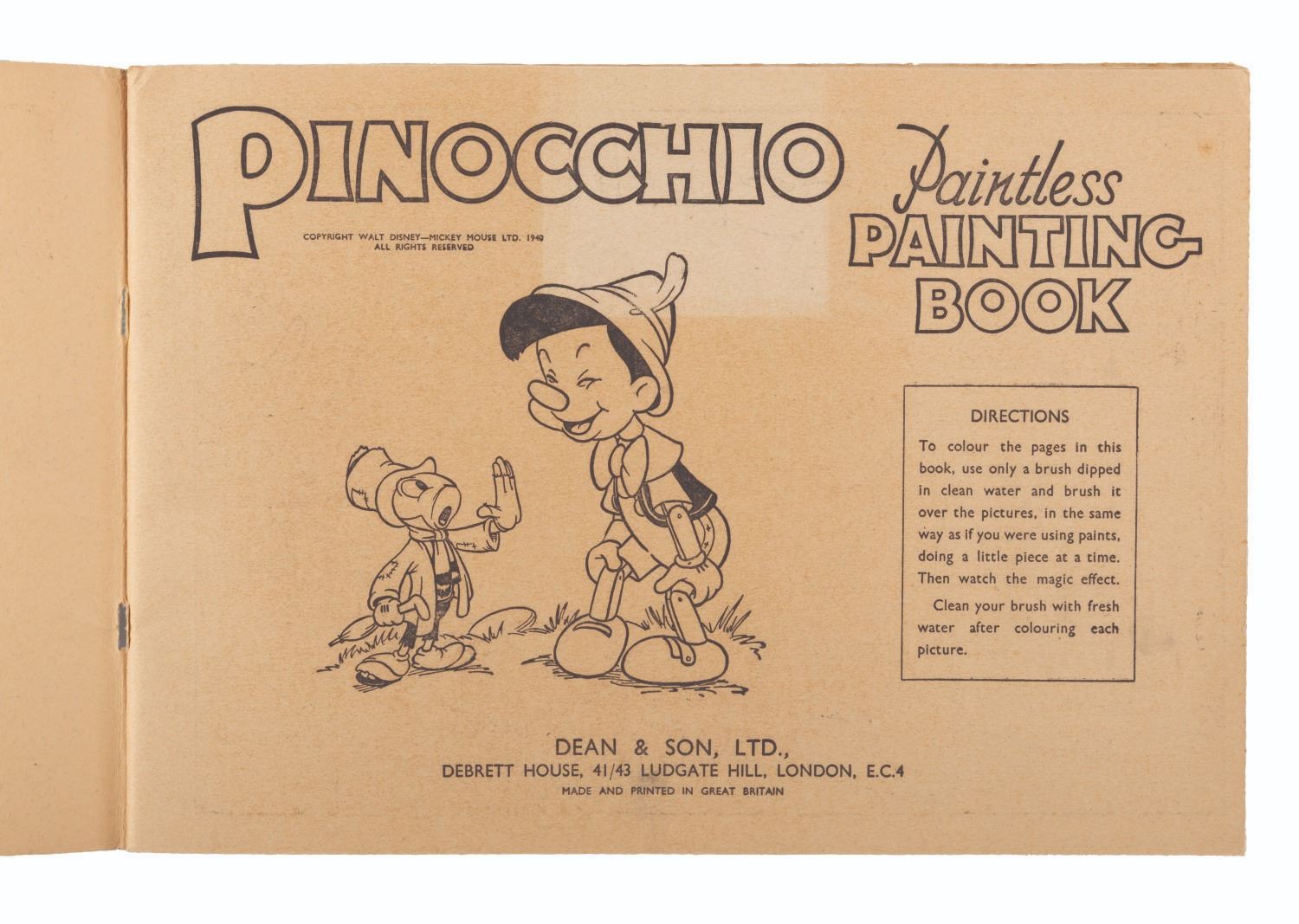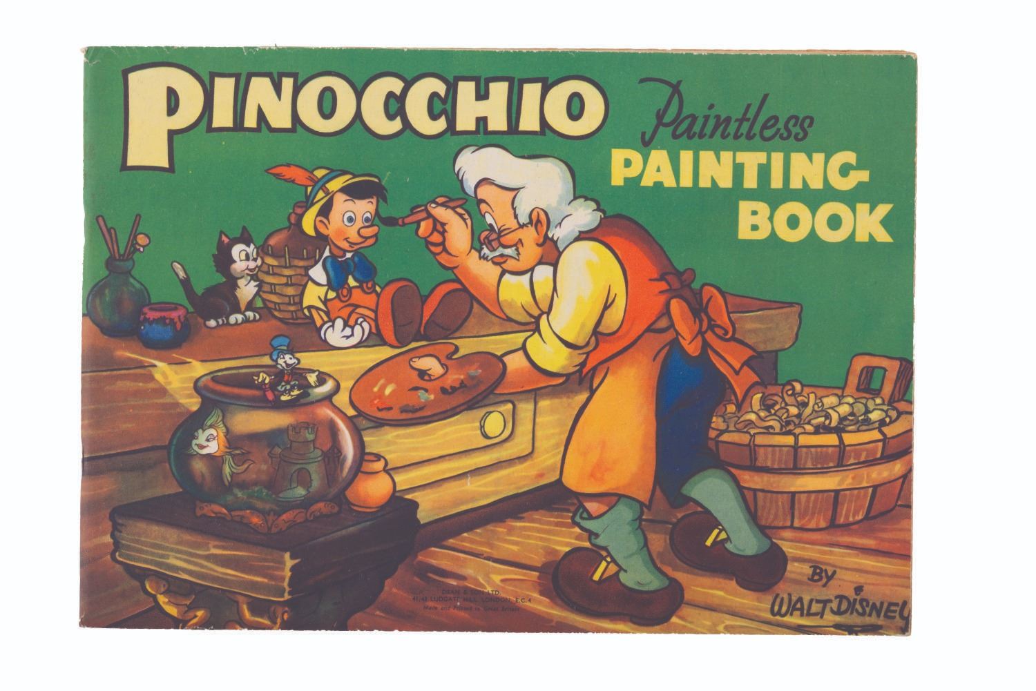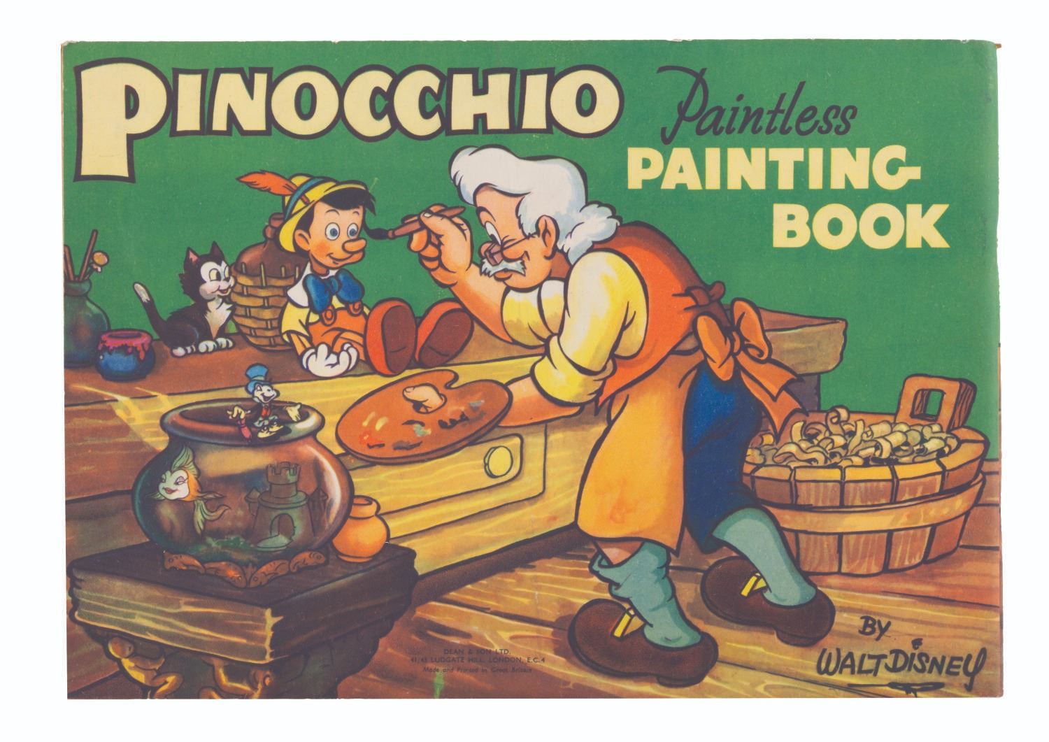 (Dean & Son, 1940) A “Pinocchio" paintless painting book published by Dean and Son of England. Measuring 8.5" x 12", the book is in very good condition with no coloring or writing, and typical light handling wear and light browning of the pages from age.