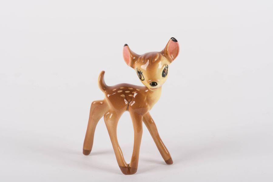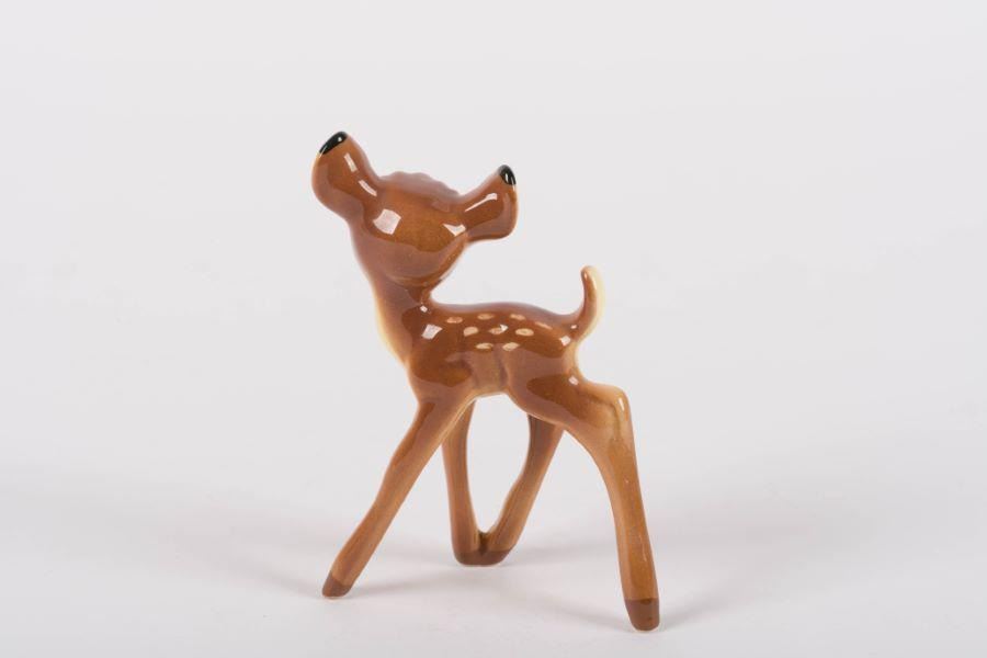 (Shaw, 1940s) A painted glazed ceramic figurine of Bambi by Shaw Pottery. Measuring 3.25" x 1.5" x 4.5" tall, the figurine is in very good condition.