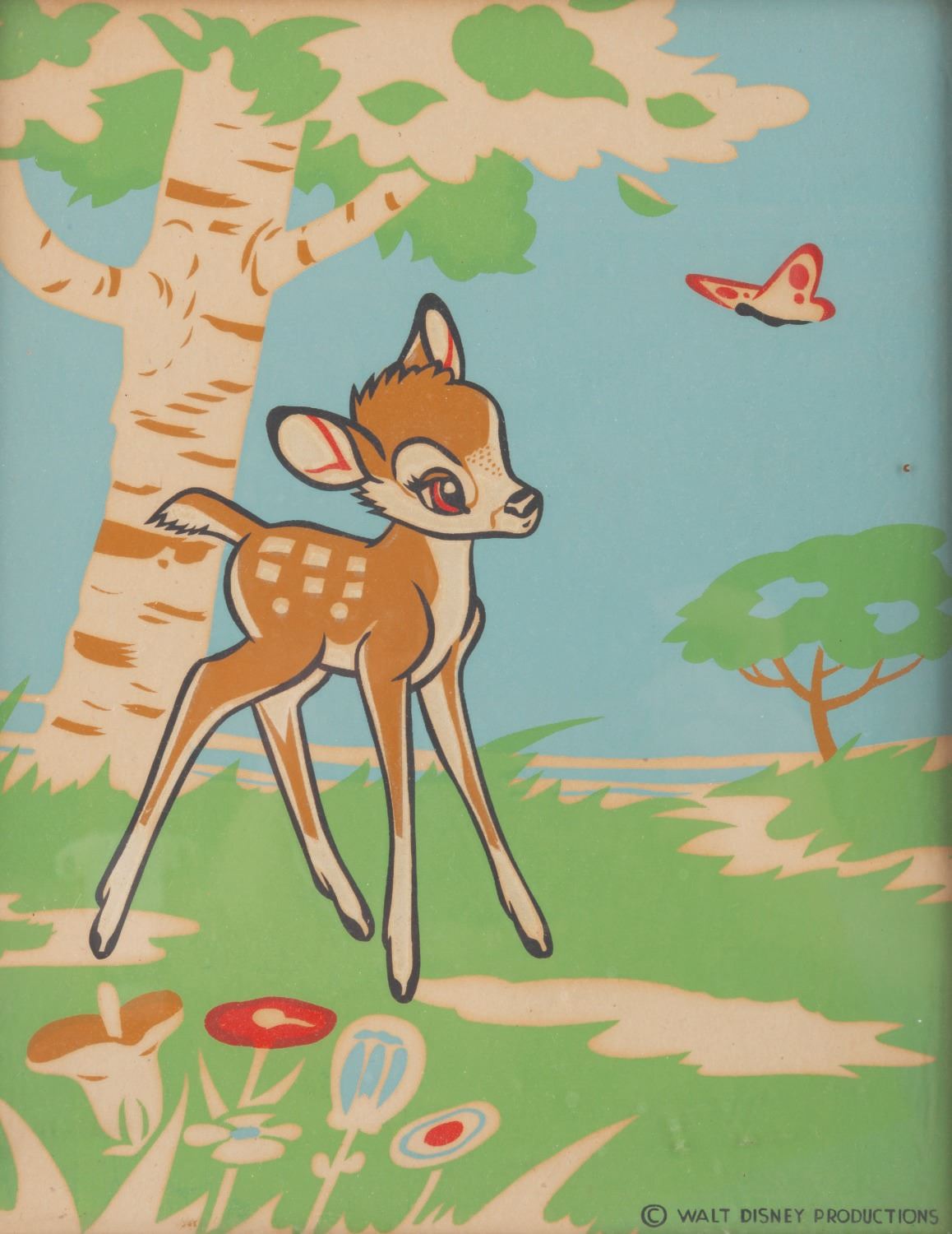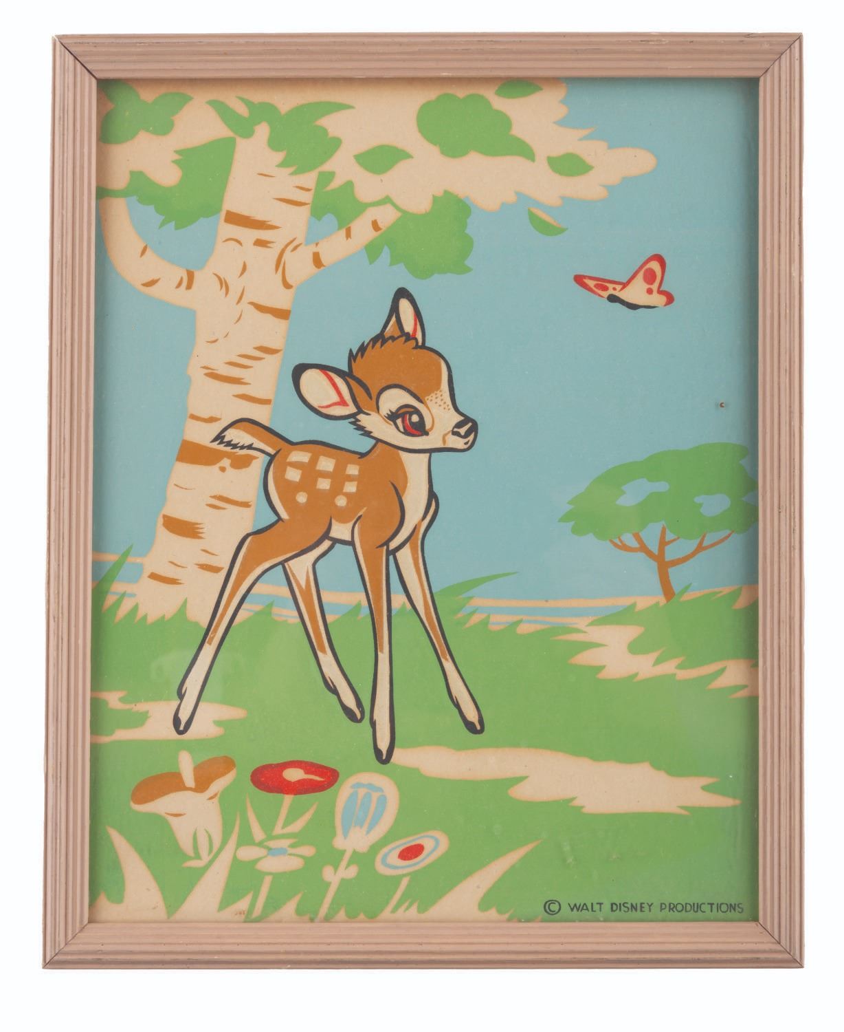 (Disney, 1940s) A silk-screened print of Bambi in the forest. Measuring 8.75" x 10.75" in the frame, the piece is in very good condition with typical slight browning from age.