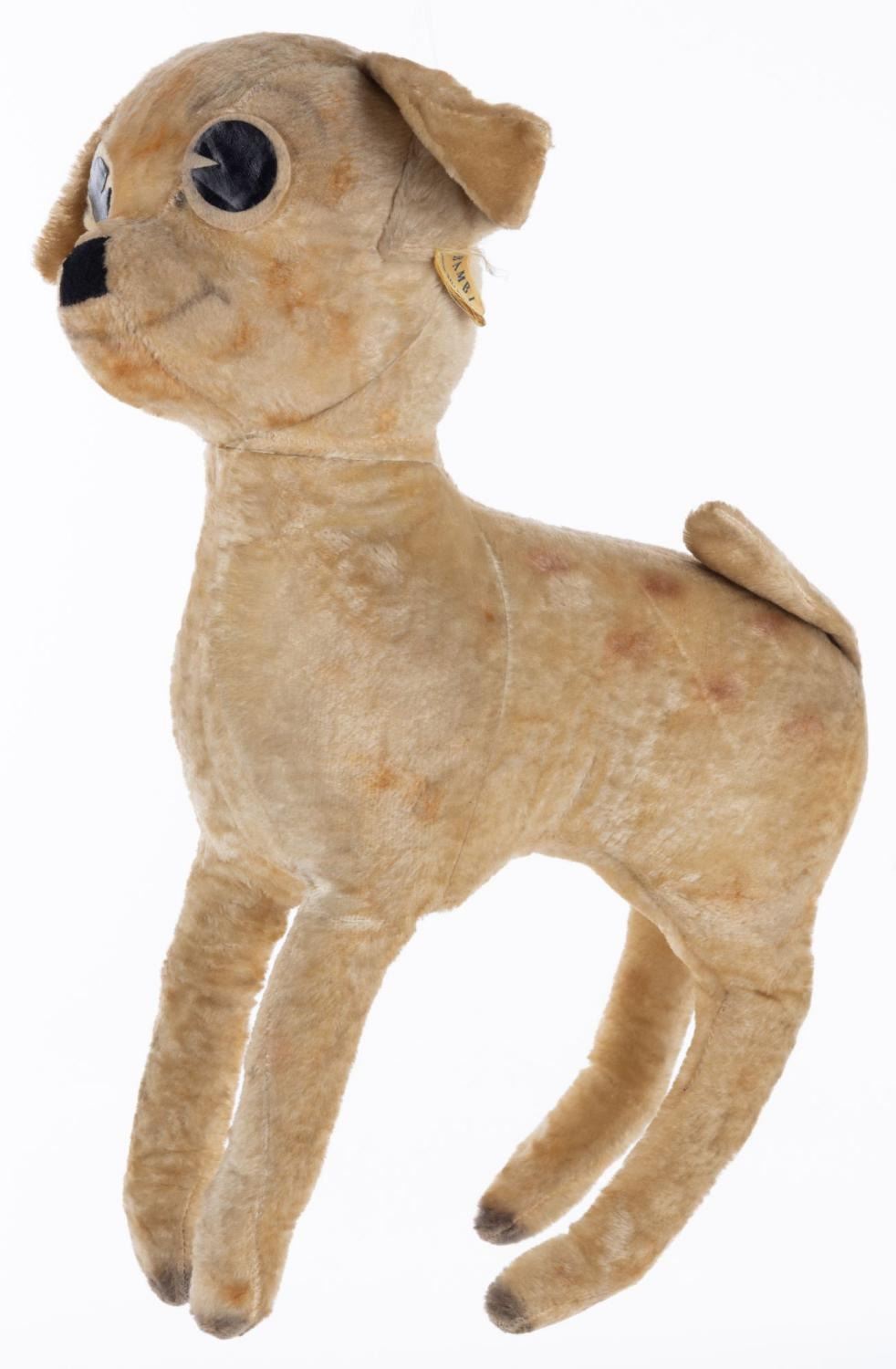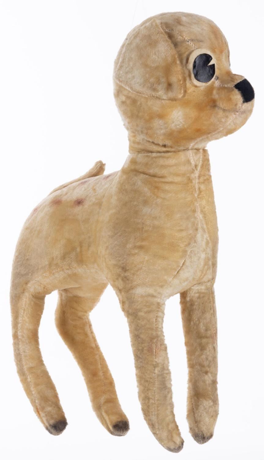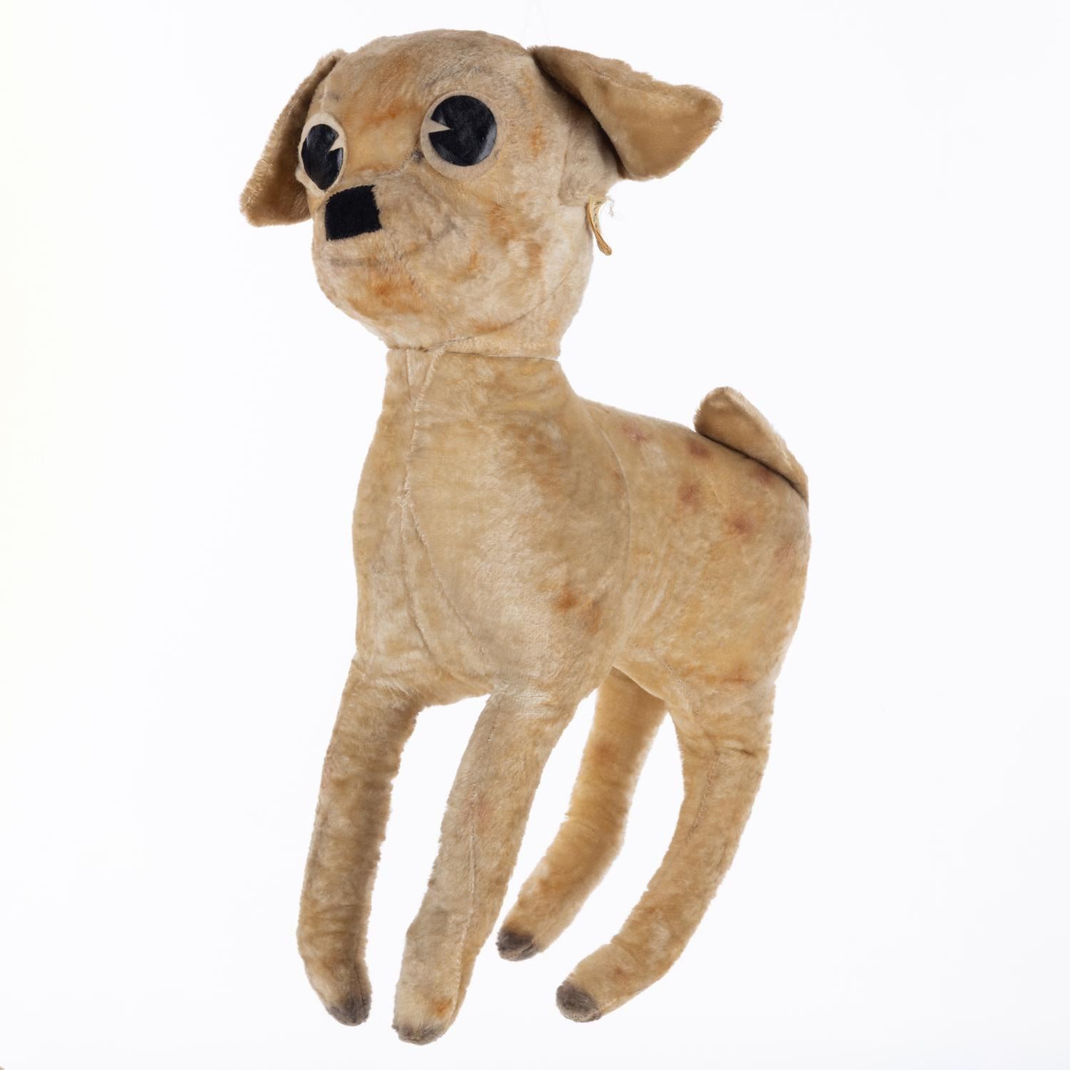 (Character Novelty Co., 1940s) An original plush doll of Bambi manufactured by the Character Novelty Company in Norwalk, Connecticut, retaining the Company’s signature tag on the left ear. Measuring 13" x 5" x 18" tall, the plush displays in fair condition with discoloration, wear, fading, and light soiling from age.