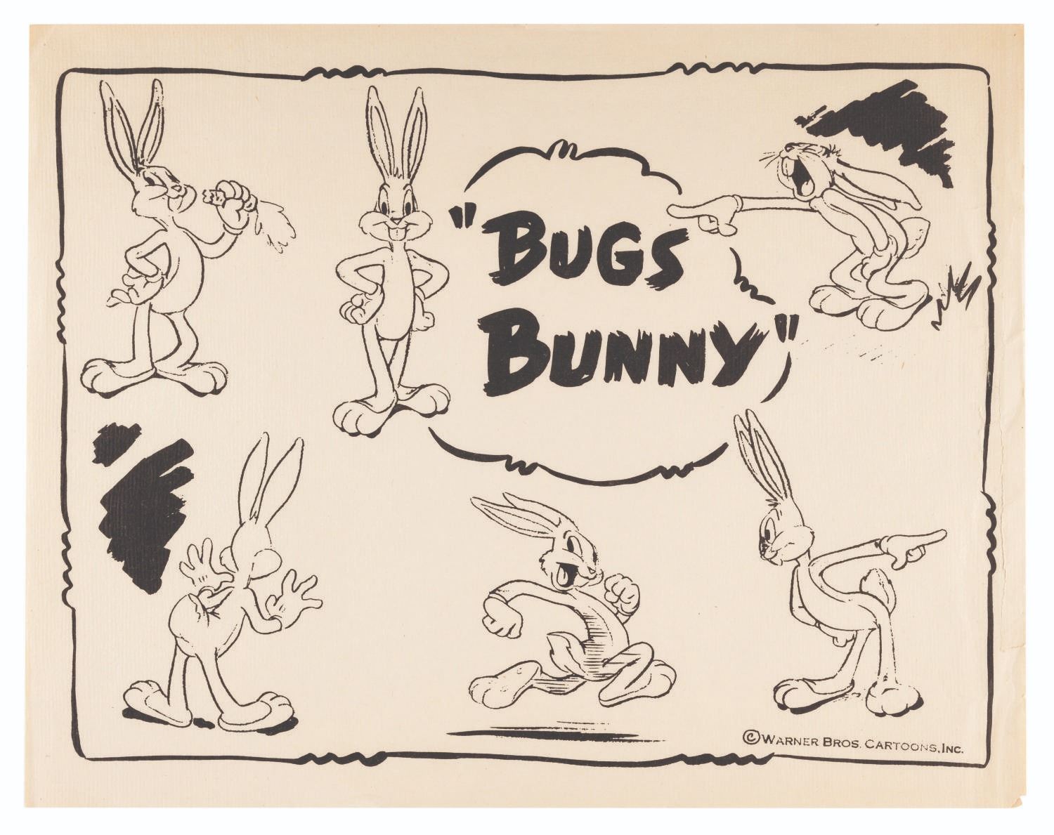 (Warner Bros., 1940s) A model sheet for Bugs Bunny as he appeared from 1942 to 1948. Model sheets such as this were distributed to animators to ensure consistency of character design. Measuring 11” x 14”, the model sheet is in good condition, with pinholes from production use, light handling wear including a soft crease to the lower left corner, wear along the right edge including a chip to the bottom corner, and a 5” tear in the border repaired with tape.