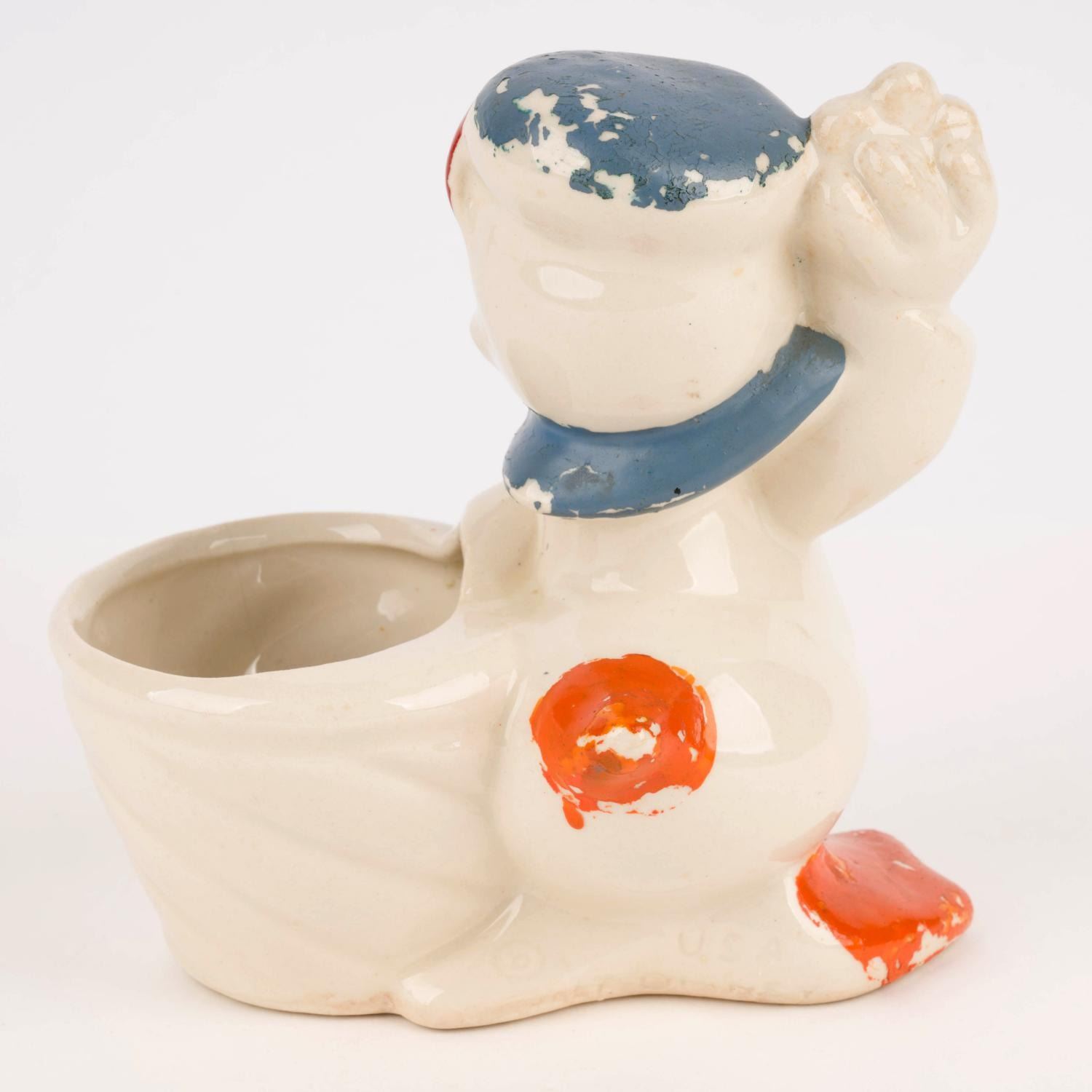 (Leeds 1940s) A Donald Duck ceramic planter by Leeds China, which held a license for Disney Pottery starting in 1944. Measuring 6" x 4" and 6.25" tall, the ceramic is in good condition with significant paint loss, crazing, and general handling wear.