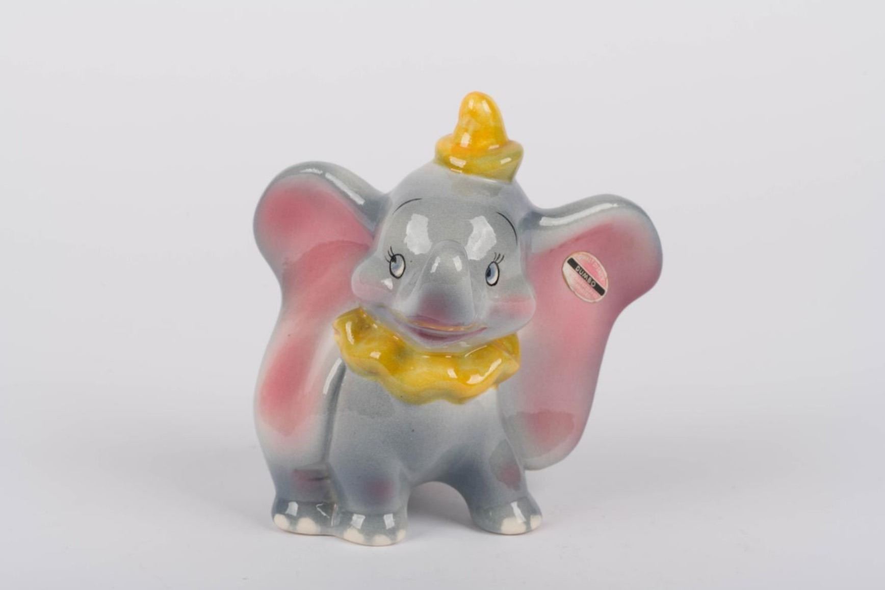 (Shaw, 1940s) A painted glazed ceramic figurine of Dumbo by Shaw Pottery. Measuring 5” x 4.5” and 5.5” tall, Dumbo is in very good condition with minor production imperfections in the glaze and some crazing.