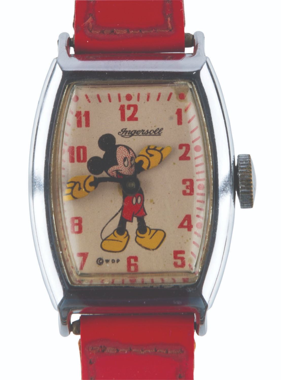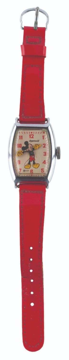 (Ingersoll, 1948) An Ingersoll Mickey Mouse wristwatch. U.S. Time took over Ingersoll post-World War II and dedicated itself to making more character watches. Because the Ingersoll name was so closely tied to Mickey Mouse watches, U.S. Time decided to keep it on the face, as seen here. The watch did not work when tested, requiring service to function. Measuring 7.5” long with a 1” x 1.25” face, the watch is in good condition with wear and cracking to the band.